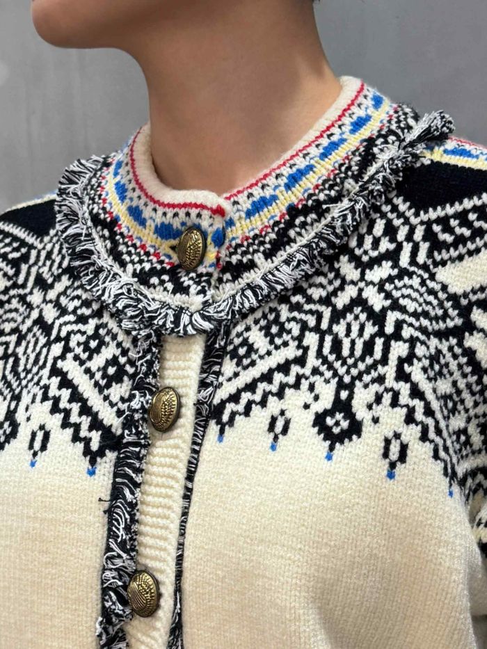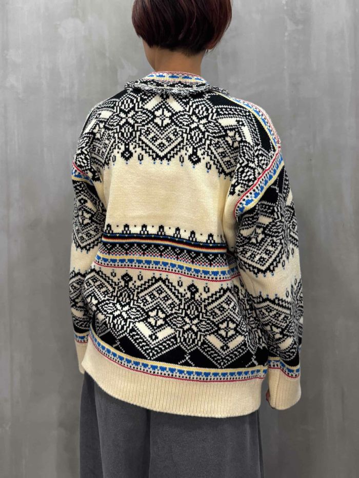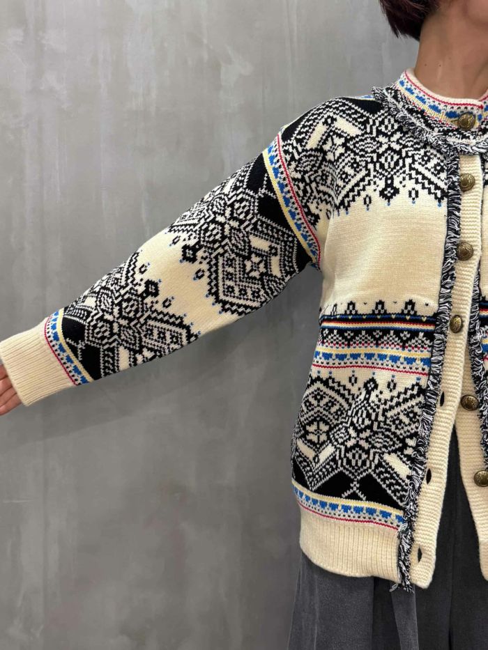 ノスタルジックで温かみのあるデザインが魅力のニットガウン。 首まわりはノーカラーに仕上げ、スッキリとした印象を演出しつつ、随所にあしらったカラフルな柄ラインが差し色としてアクセントに仕上げました。 フロントのフリンジが華やかさをプラス。 シンプルなデニムと合わせるだけで、こなれ感のある冬のスタイリングが完成する一着です。