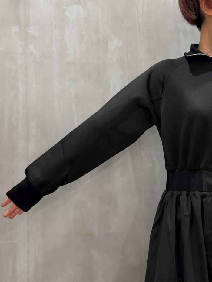 ■袖下をスカートと同様の素材で切り替えアクセントをプラス
