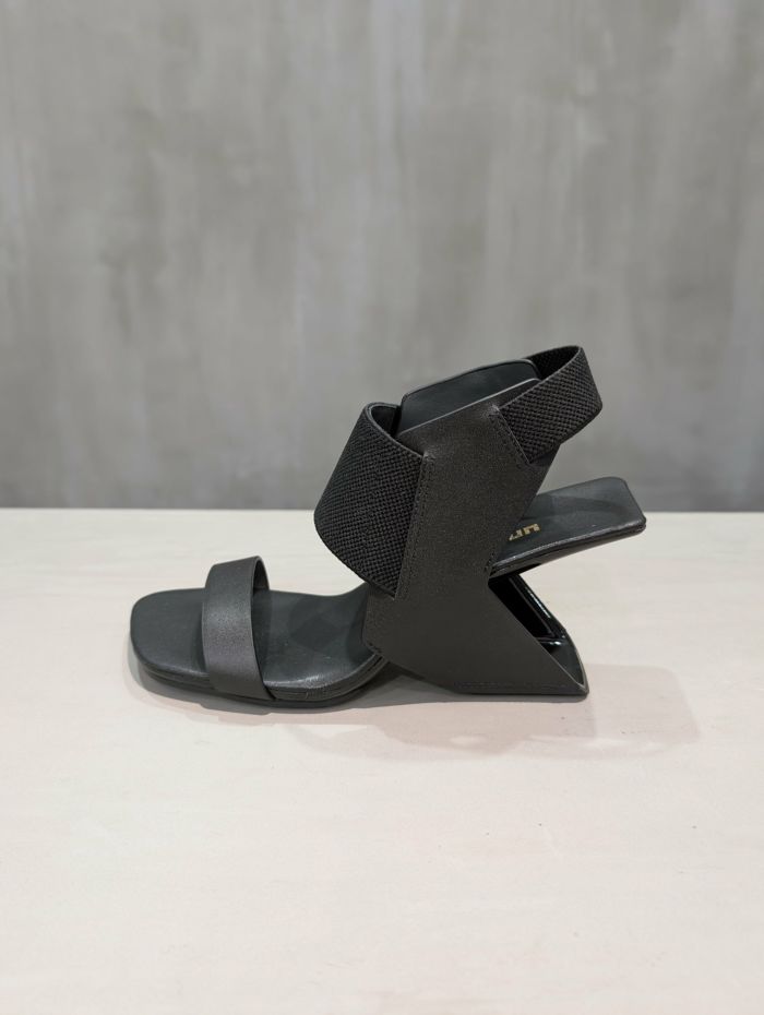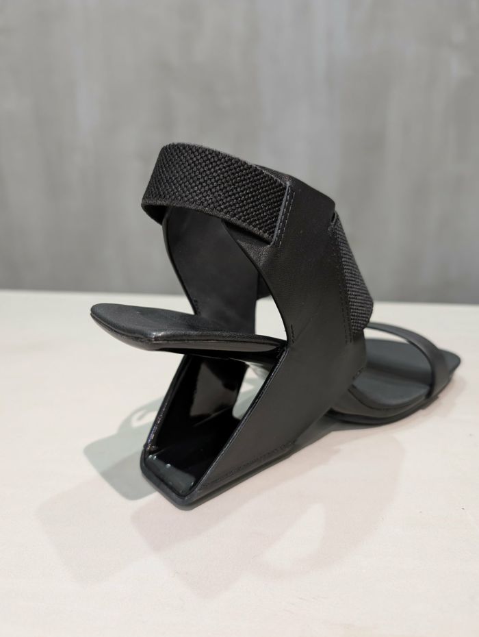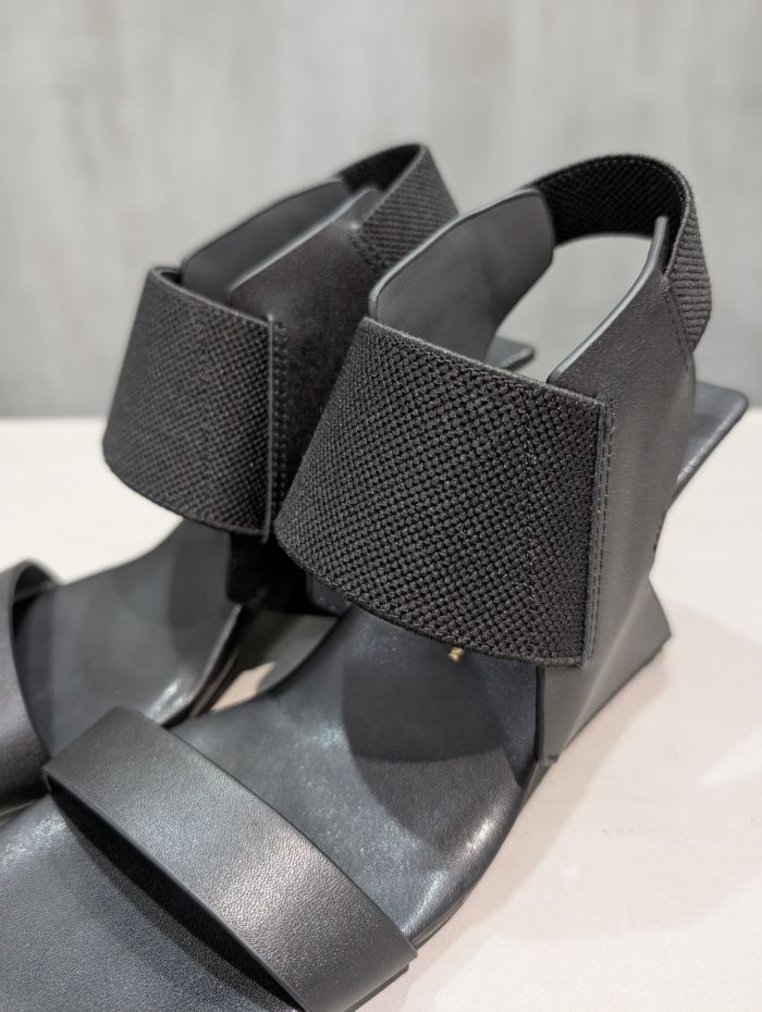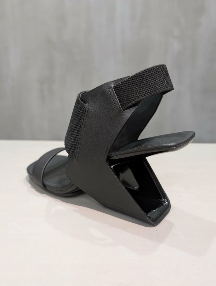 デザイン性と安定性を兼ね備えた構築的なヒールが人気の一足。