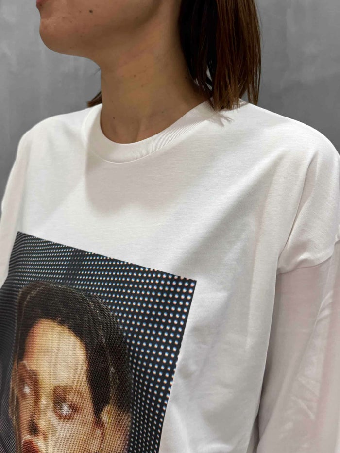 大胆なグラフィックプリントが目を引くロングスリーブTシャツ。