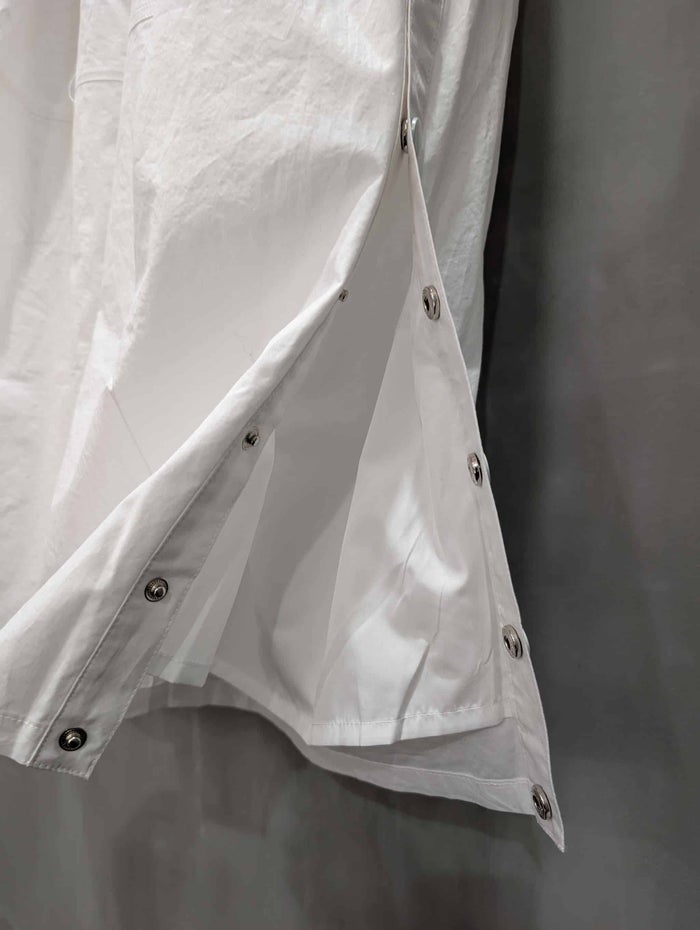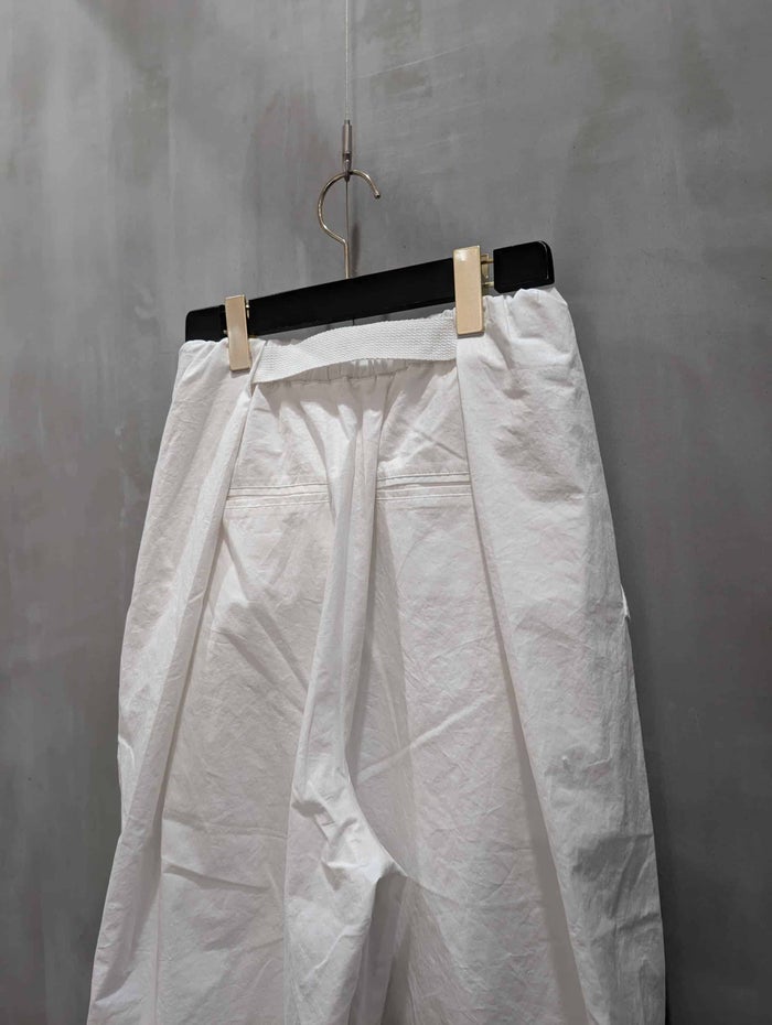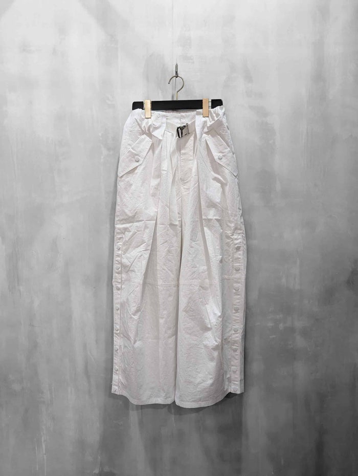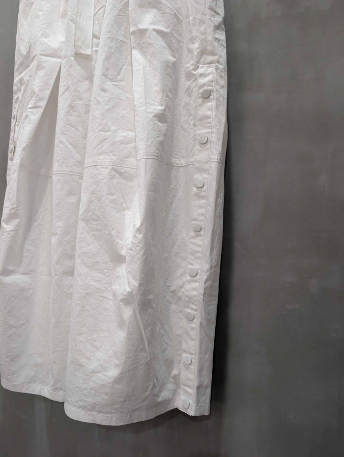 深い両サイドのタックがウエストをスッキリ見せてくれます。裾両サイドのドットボタンを開けると深いスリットとしてもシルエットを変化させられ、夏まで涼しくご着用いただけます。