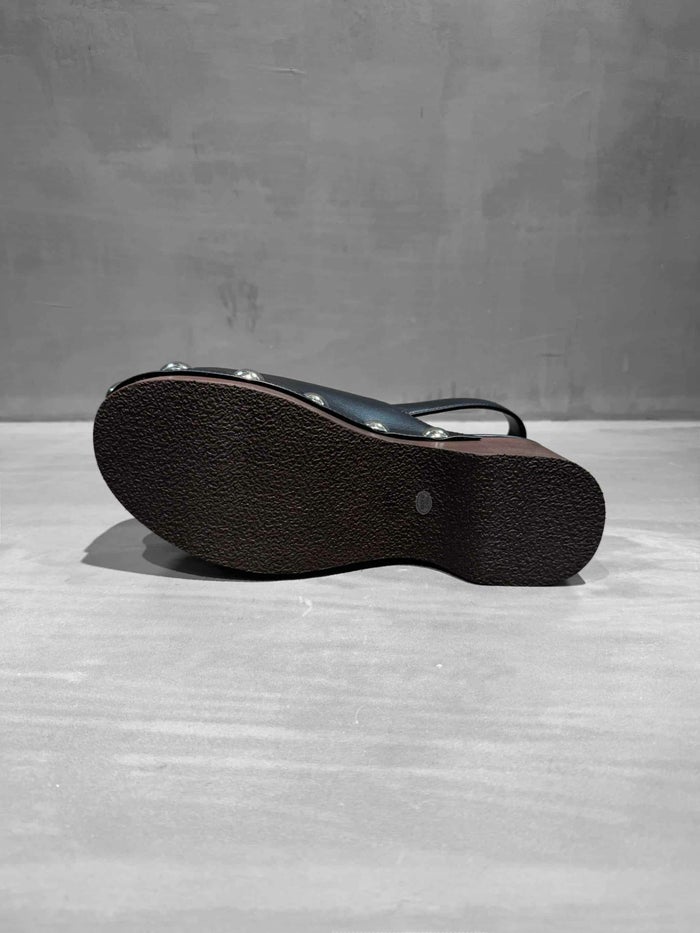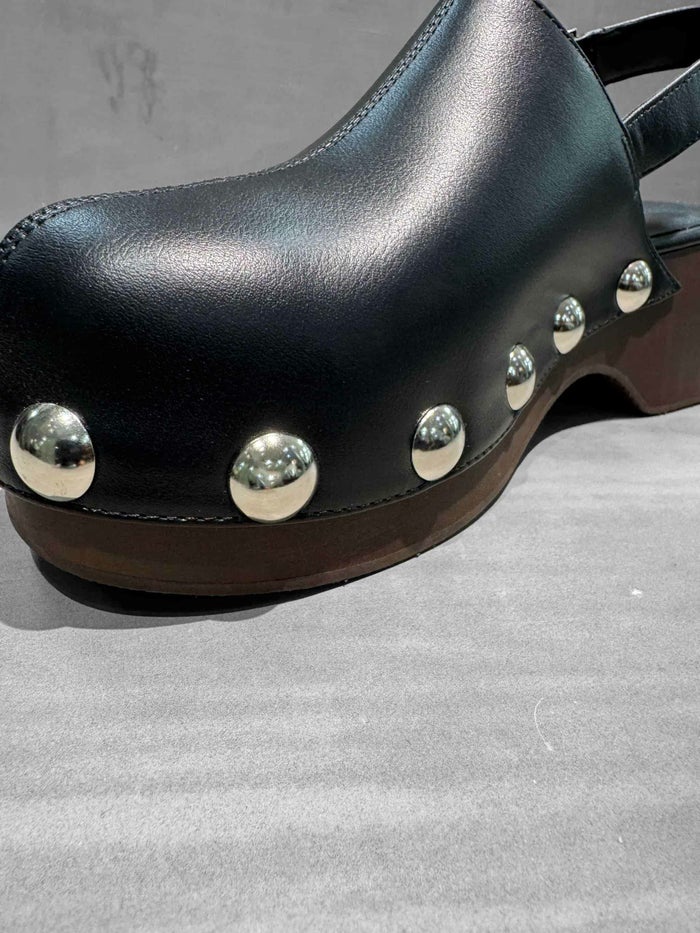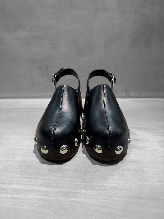 カジュアルになりがちなサボデザインを、ダークブラウンに染色したウッドと大きめのメタルスタッズでモードに昇華した一足です。