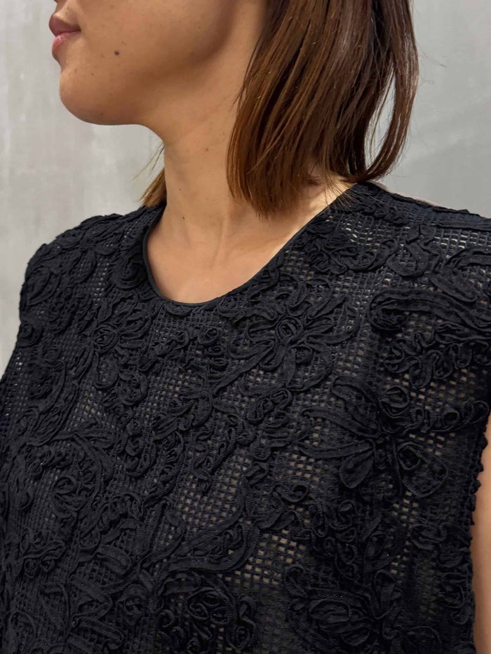 華やかでも快適な着心地。立体的な綿レースをドッキングしたオールインワン。シワになりにくく肌離れがいいツイル生地を使用し、一日中綺麗なシルエットをキープできます。縦横にストレッチが効いて動きやすく、ストレスフリーな着心地。薄手で、ロングスリーブのインナーをレイヤードすればシーズンレスにに着用いただけます。インパクトあるモチーフのレースは、ネット状編み地に綿テープで柄を描いており、クラフト感あふれるナチュラルなムードが魅力的。ジャケットやカーディガンとも相性がよく、でデイリーからオケージョンまで幅広くするアイテムです。