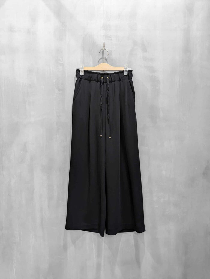 大人気のダブルクロスを使用したワイドパンツ。リラックスな履き心地ながら、上品なドレープと光沢感が大人なシルエットを演出。年間を通して着用できる大人気のロングセラーアイテム。同素材のジレとのセットアップもお勧めです。