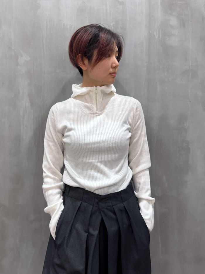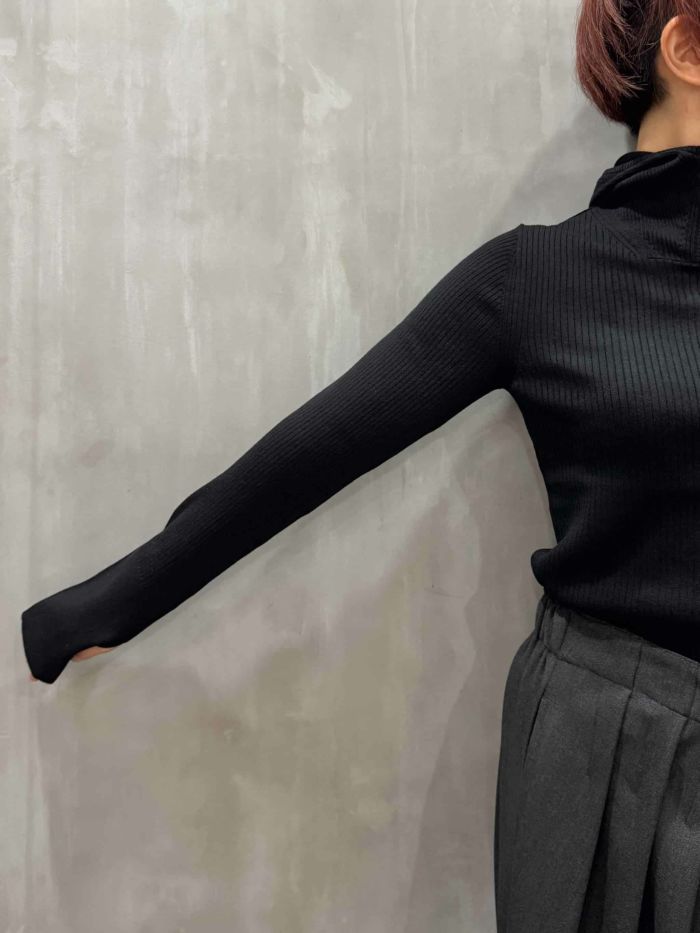 繊細なストレート糸を用いて編んだ、やわらかさとキックバックのよいリブニットです。