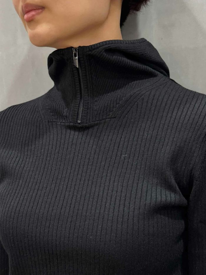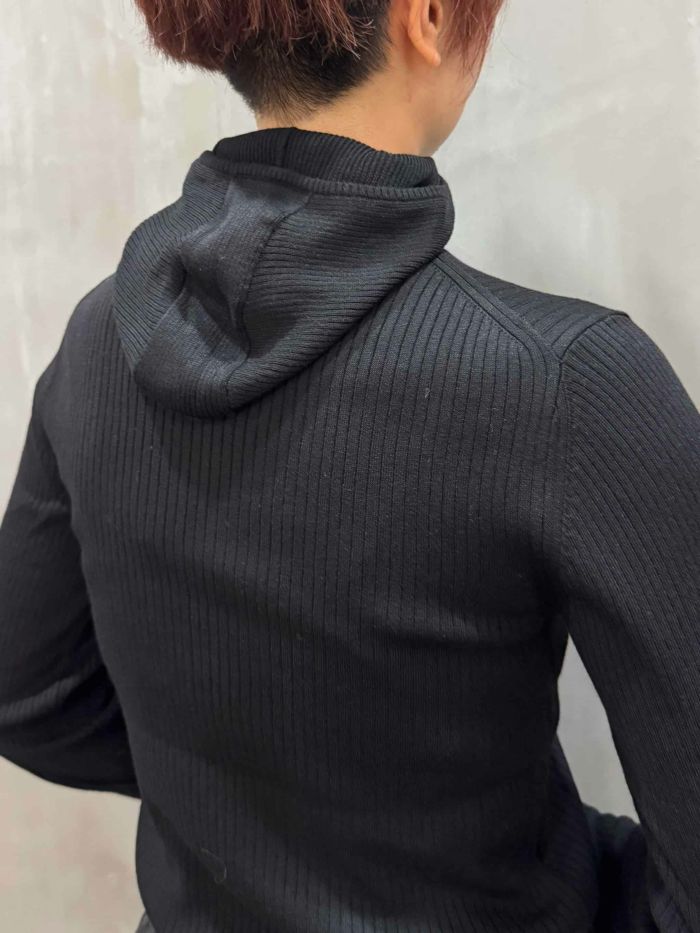 襟元にファスナーがついているフーデッドのリブニットプルオーバー。