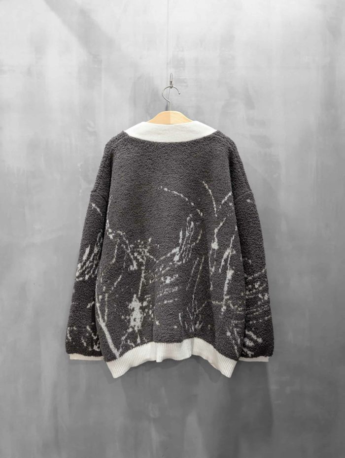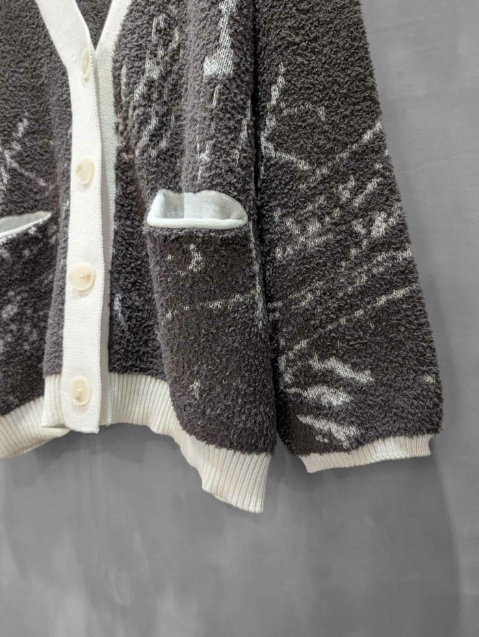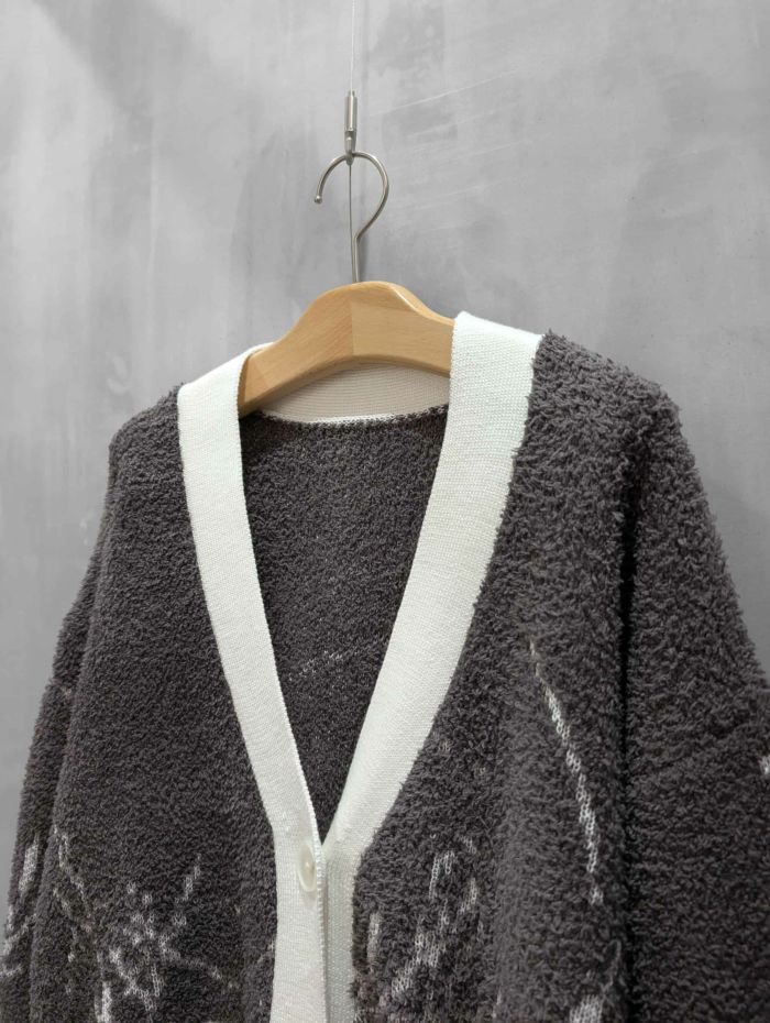 肌触りが非常に良くとても暖かいモフモフニットです。素材がモフモフしていて可愛らしいのですが、柄は大人っぽい印象の抽象的なが柄域なので、子どもっぽさが抜けていいバランスで着こなせます。ボタンが大き目で可愛いのもポイントですね。