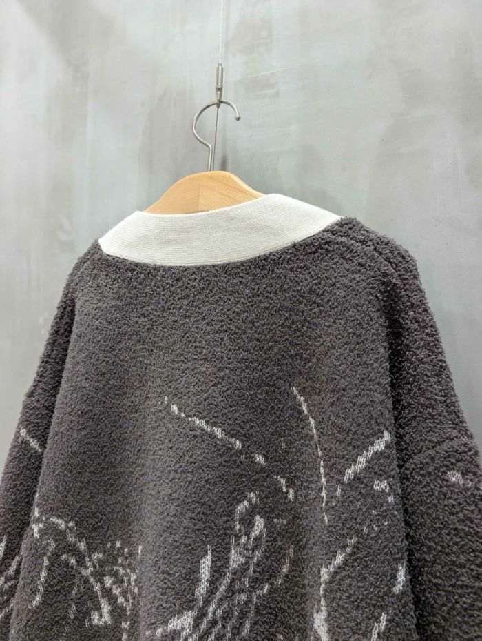 肌触りが非常に良くとても暖かいモフモフニットです。素材がモフモフしていて可愛らしいのですが、柄は大人っぽい印象の抽象的なが柄域なので、子どもっぽさが抜けていいバランスで着こなせます。ボタンが大き目で可愛いのもポイントですね。