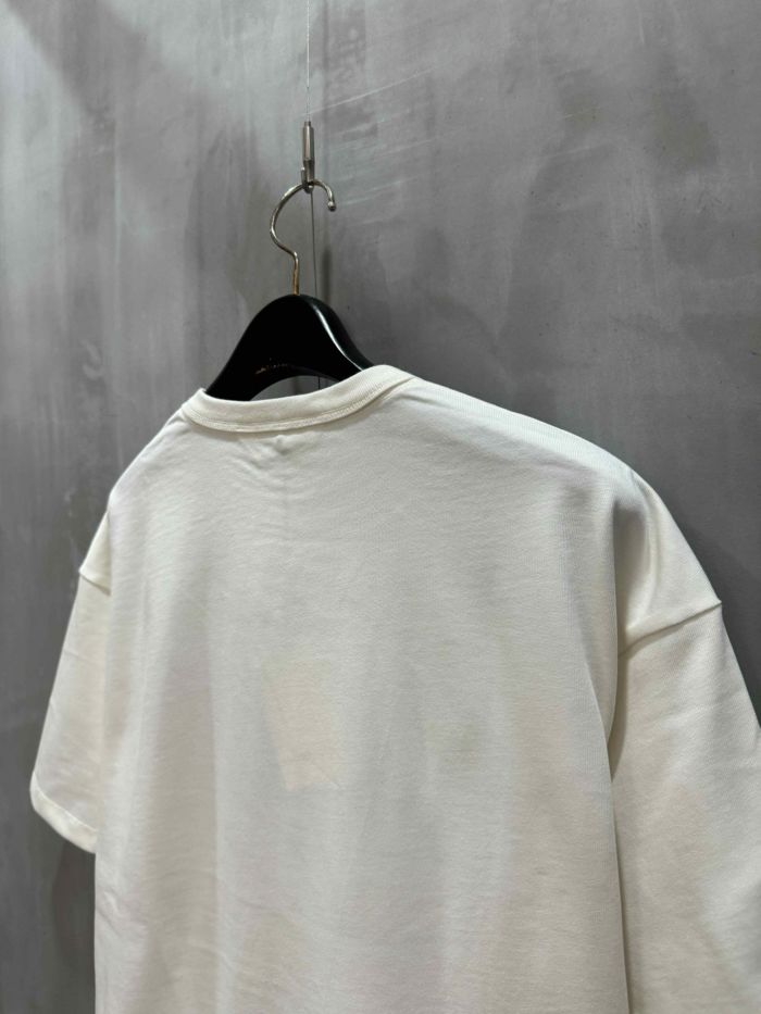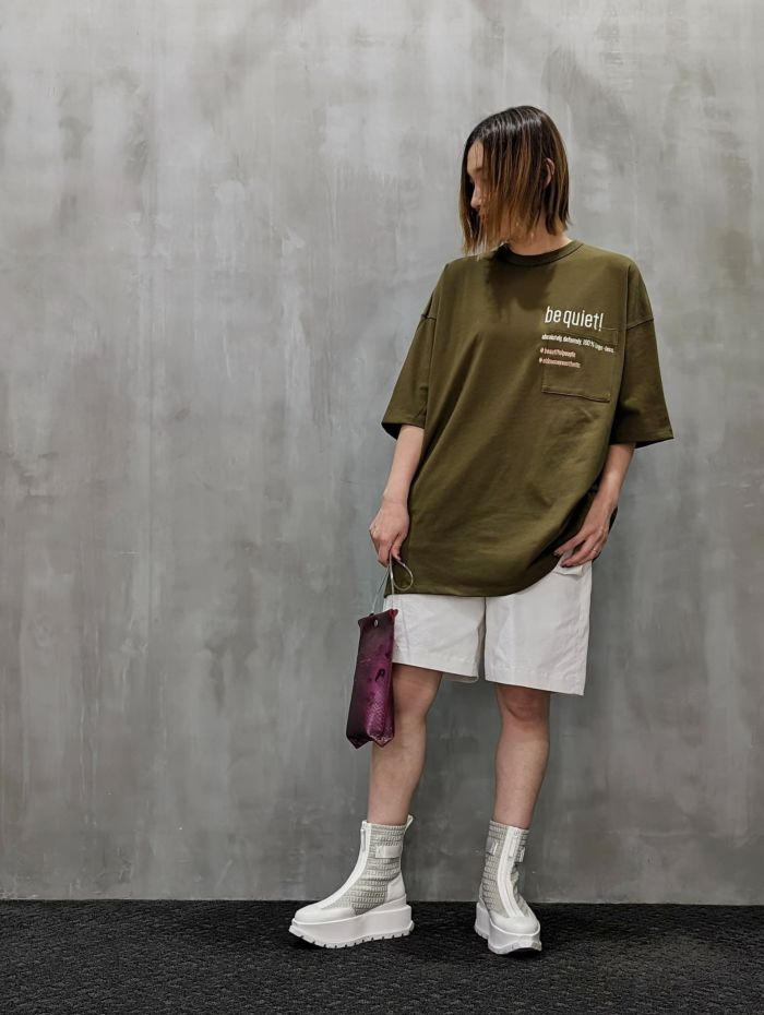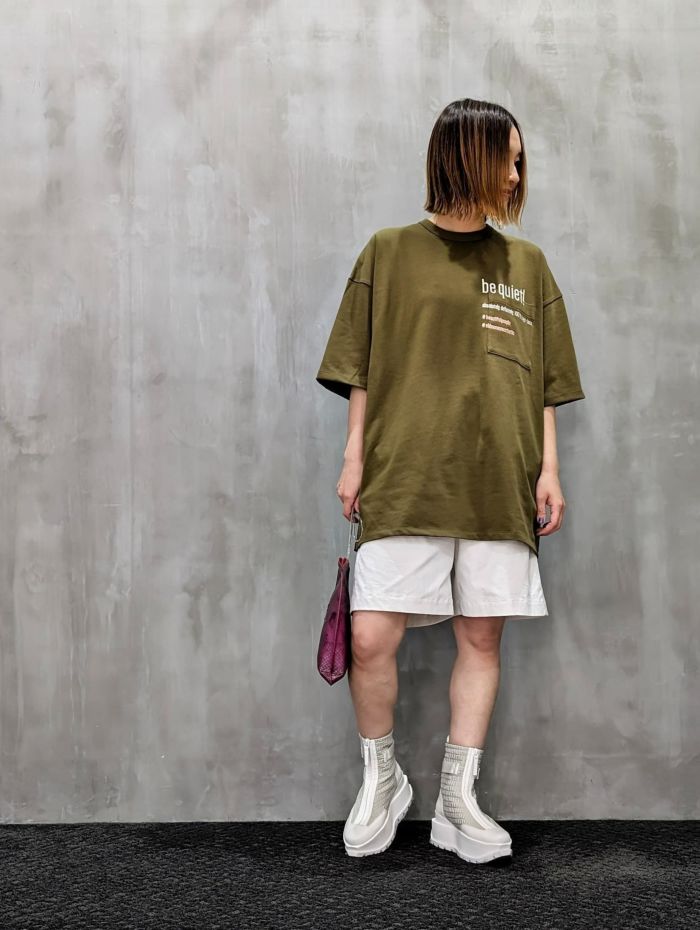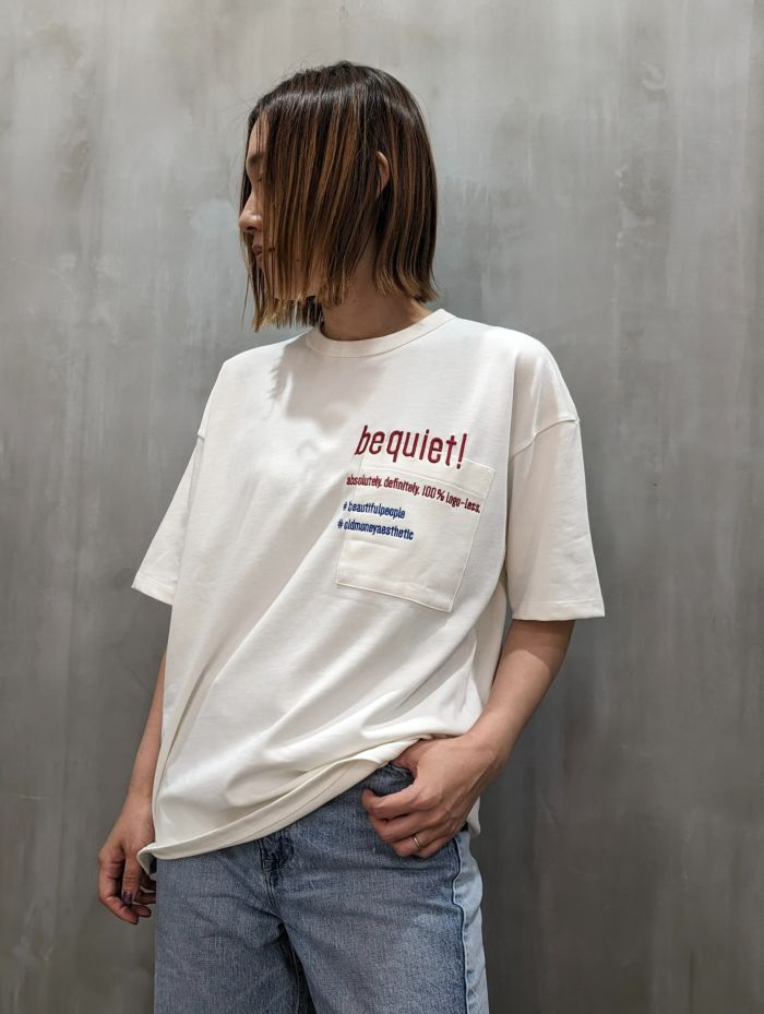 洗練されたデザインと贅沢な素材感が特徴のオーバーサイズTシャツ。たっぷりとした分量感のシルエットで、リラックスしたスタイルとモダンな印象を兼ね備えています。左胸にはポケットがあり、タイポグラフィーのメッセージロゴ刺しゅうが施されています。立体的で厚みのある刺しゅうが、シンプルなデザインに個性的なアクセントを加えています。