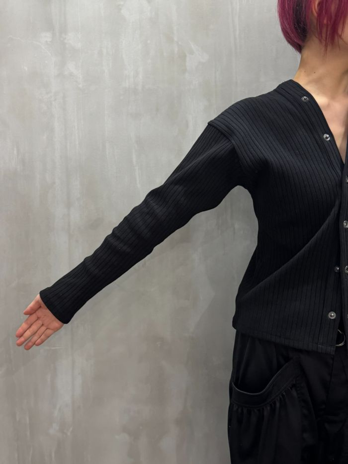 前後どちらでも着用できる2WAY仕様のカーディガンTOPは、デザイン性と機能性を兼ね備えた一枚です。地の目を活かしたVネックのカッティングがシャープな印象を与えつつ、ボリュームのある袖幅がシルエットのアクセントになり、全体のバランスを美しく演出します。
