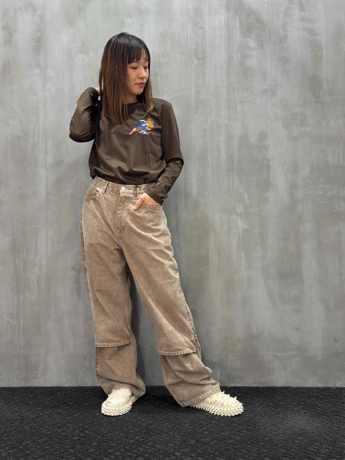 特徴的なフリップヘム(折り返し裾)のディテールが、スタイリングにさりげない個性をプラス。ストレートなシルエットとハリのある生地感により、モード感とカジュアルさが絶妙に両立し、Tシャツやシャツとのシンプルなコーディネートも格上げしてくれます。