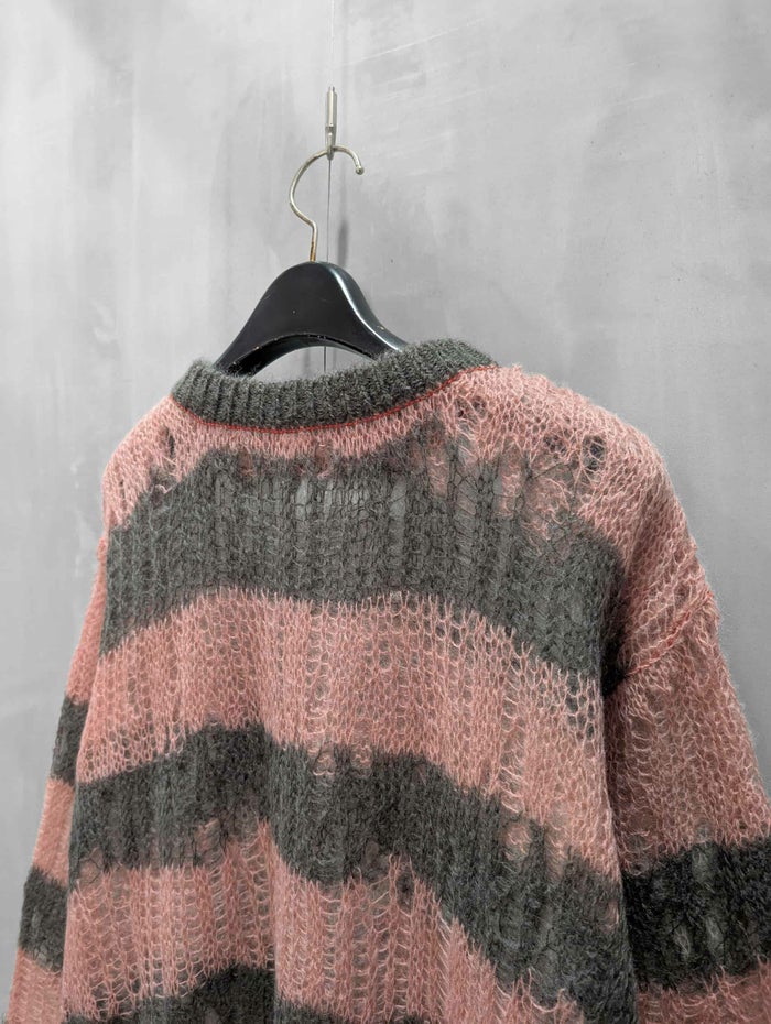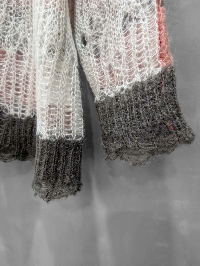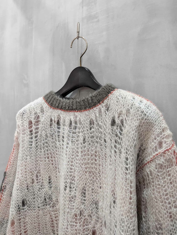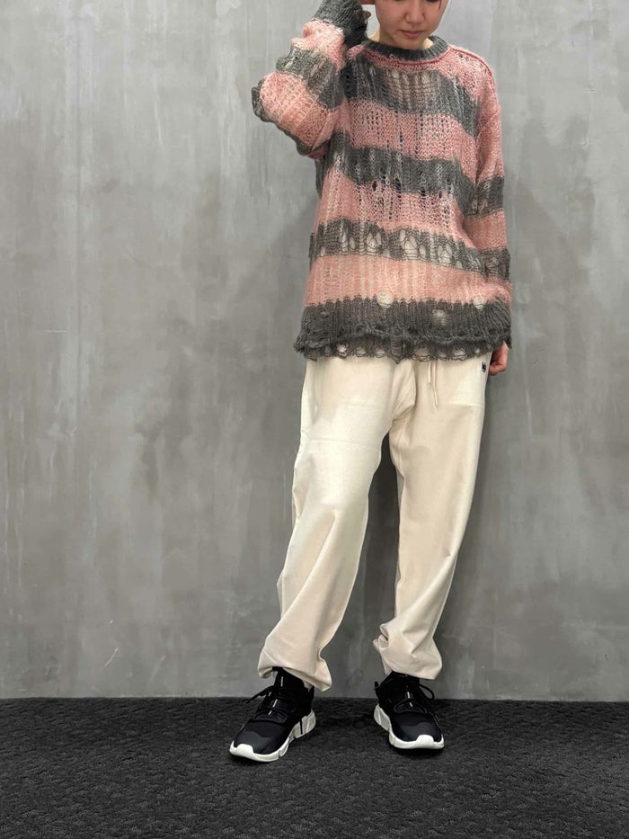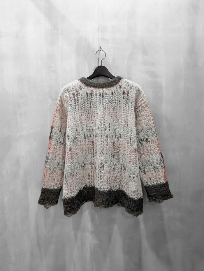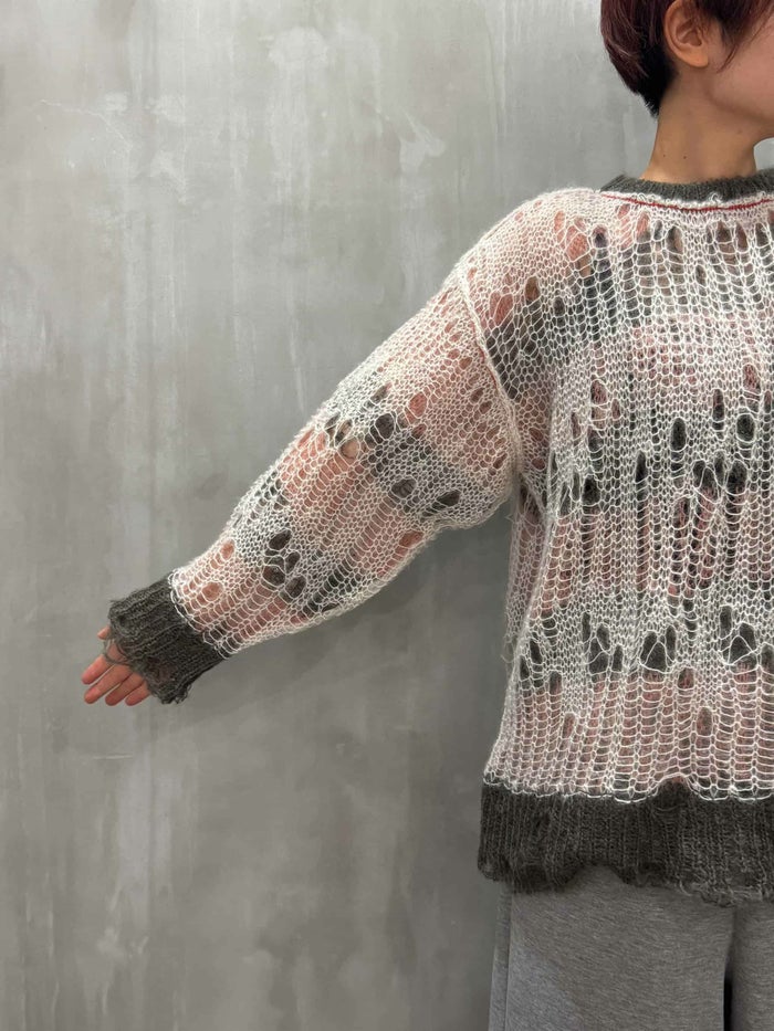 針抜きとダメージ(ぼろ)柄をボーダー状に組み合わせ、透け感と立体感のある表情を演出します。