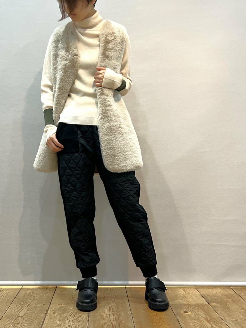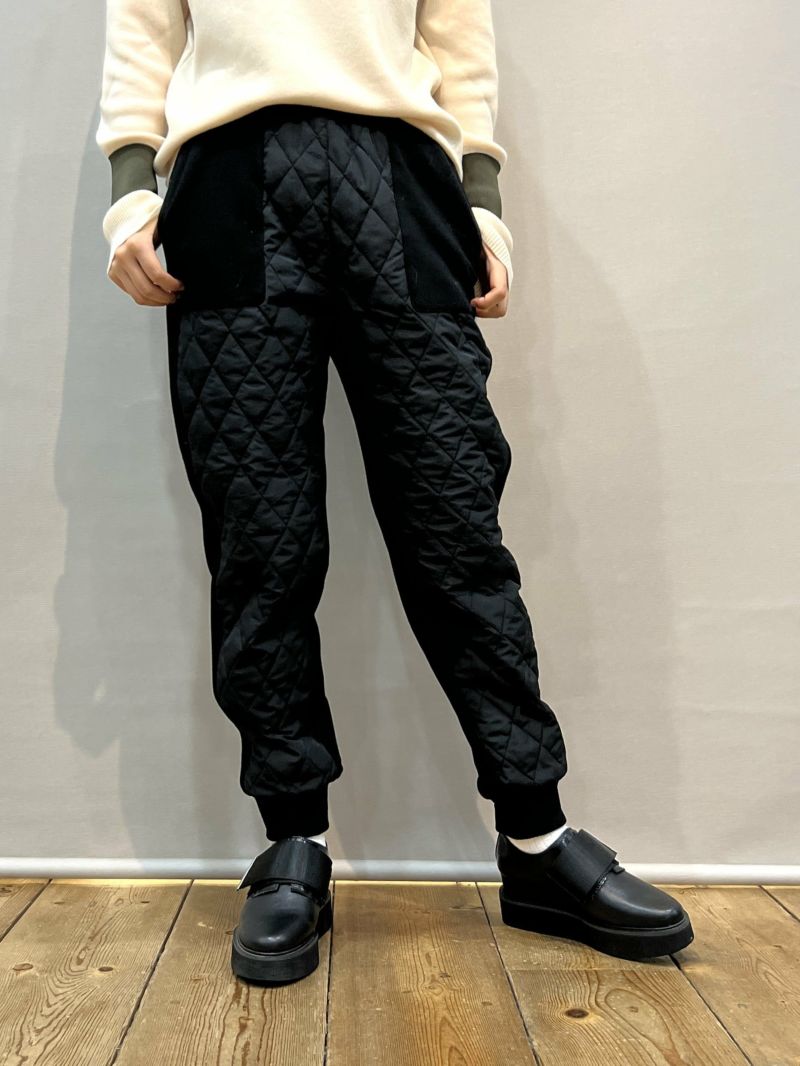 型崩れしにくい、薄中綿使いのサンドイッチキルティング×裏起毛スウェットジャージーの異素材使いのジョガーパンツ。