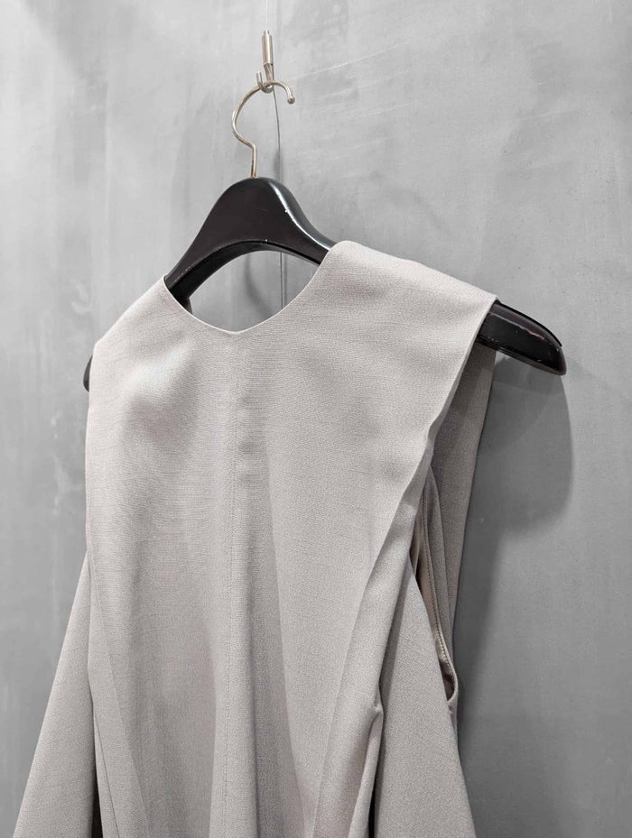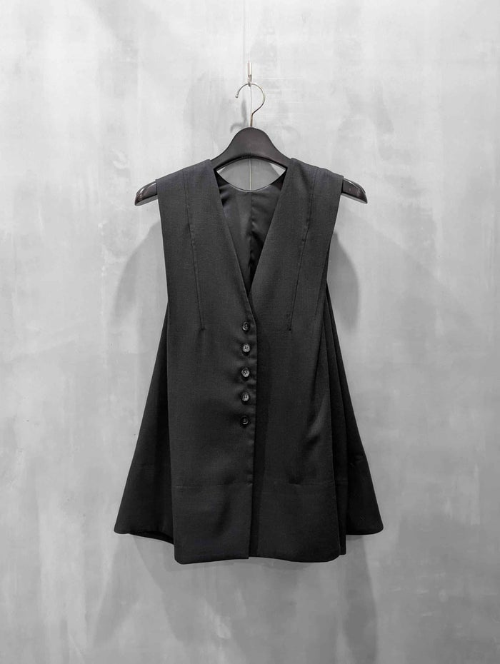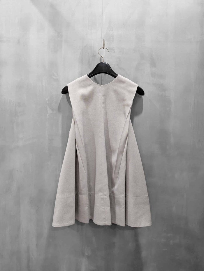 前後2way仕様のAラインベスト。素材には、天然繊維を思わせるようなタッチのポリエステル素材を使用。リネンライクのポリエステルを使用することで、軽く、シワにもなりにくく、ご家庭でイージーケアもして頂ける素材です。前後2wayでクルーネックとVネックになっている為、インナーのレイヤードによって様々なコーディネートが可能で、ロングシーズン着用して頂ける優秀アイテムです。両サイドにはポケットも施し、Aラインのシルエットはショルダー部分のタックでシャープになるよう仕上げました。フェミニンになり過ぎずモードな雰囲気で、細めのパンツやテーパードはもちろん、同素材のカーブパンツとセットアップの着用もおすすめです。