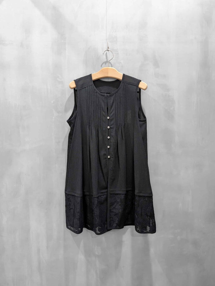 フロントとバックにピンタックをあしらい、すっきりとしたノースリーブ×ゆるやかなフレアシルエットで上半身を華奢に見せてくれます。