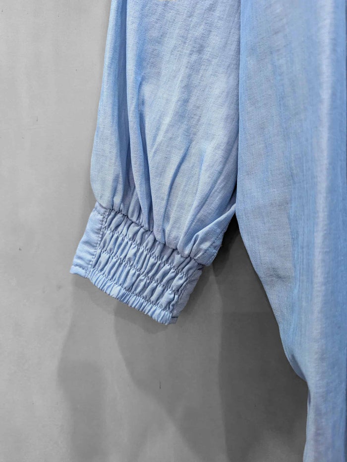 袖口は部分的にシャーリングにすることで腕まくりしやすいよう設計しています。