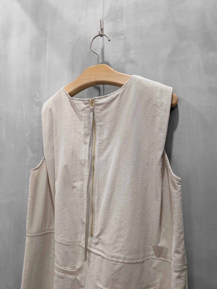 袖口のタックで二の腕周りをカバーして、縦ラインを強調するフロント切替がすっきりとした印象を演出。