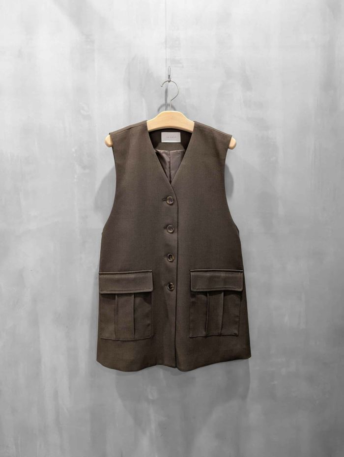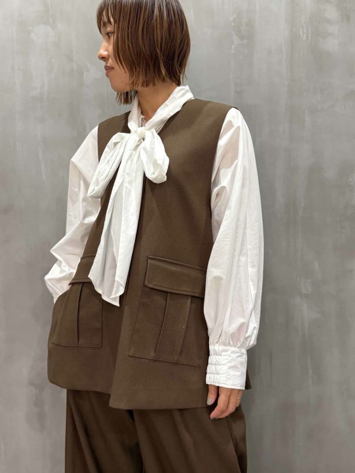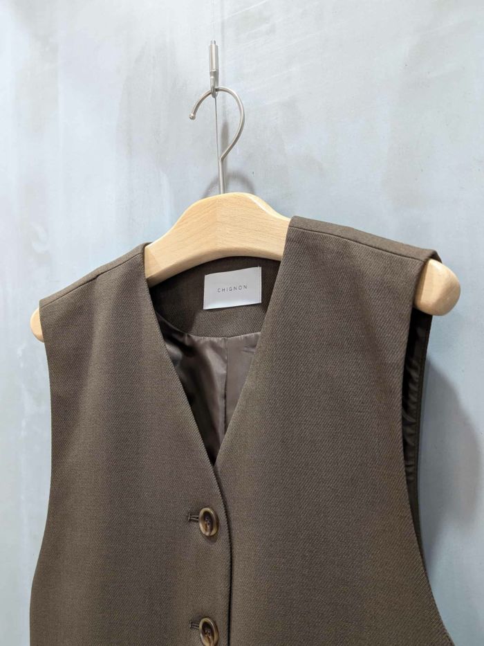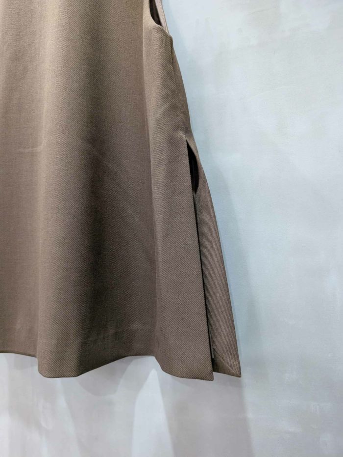 全体的にフレアのシルエットになっているので、腰回りのラインを拾わずスタイルアップして見えるベストになっています。