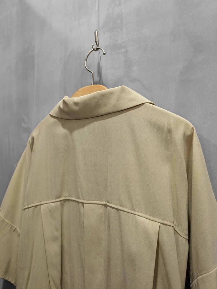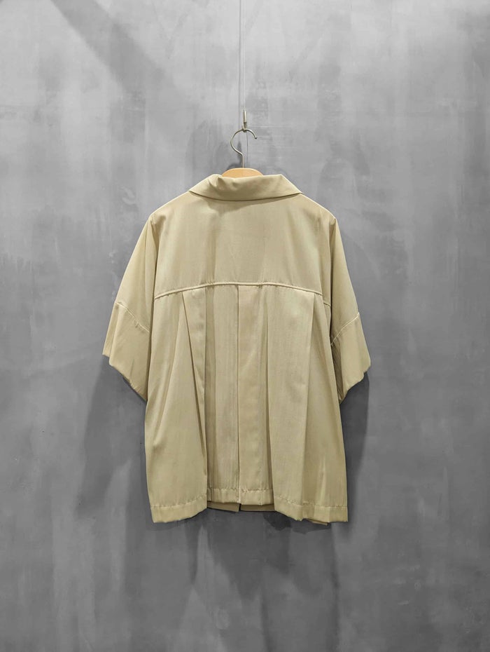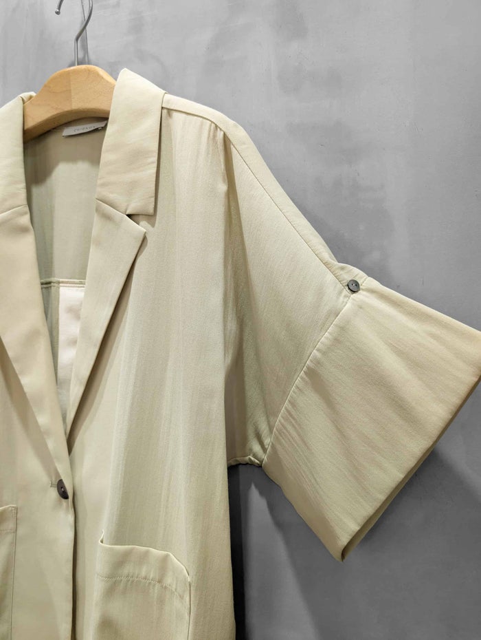 ナチュラルなシワ感のあるTCローンを使用。 程よいシアー感で、清涼感のある素材で、夏にオススメな素材です。 袖丈は肘まで隠れる半袖タイプから、ロールアップで短くもできる2WAY仕様。 テーラードカラーできちんと感もありつつ、バックスタイルは大胆なベンツ明き仕様で抜け感もプラス。 ゆったりとしたサイズ感でもすっきりと見えるように、裾を少しだけ狭め、ヘムラインも前側を長めにするなど、絶妙なバランス感に拘りました。 パンツとセットアップではもちろん、シャツ感覚で羽織れるライトなジャケットで、どんなコーディネートでも合わせやすい1枚です。