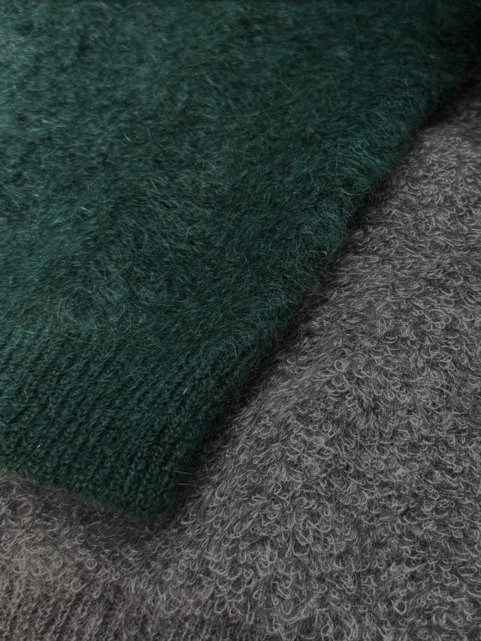 モヘアの毛足とループのふんわりとしたファンシー感のある外見を活かす裏使いで、ニット製品で最も良いとされる縫い代がゴロつかずすっきり仕上がるリンキングによる丁寧な縫製で仕上げています。