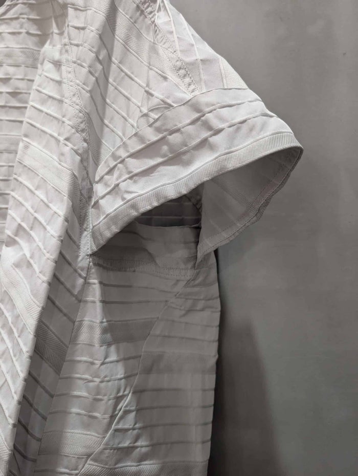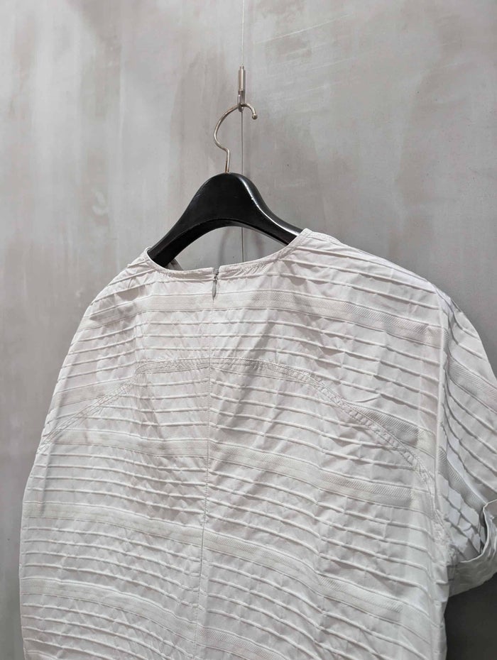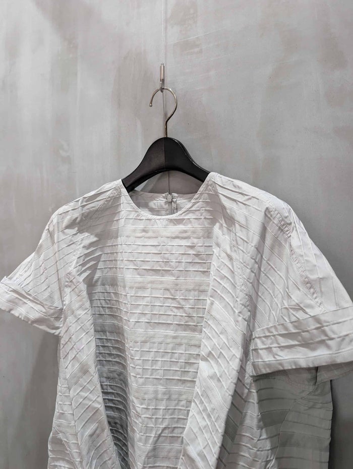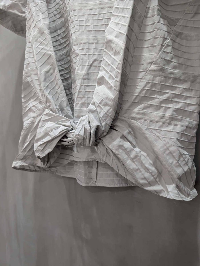 桐生の歴史ある機屋で高密度に織り上げられた、PEハイカウント糸のボーダージャカード。 ボーダー間の組織を変えることでテンション差を生み出し、生地表面に自然な凹凸感を表現しました。 さらに、間のボーダーにはイル組織をヘリンボーン状に織り込み、視覚的な変化とさりげないアクセントを加えています。 立体感と上品な表情を併せ持つ、洗練された独特な張り感のあるジャカード素材です。