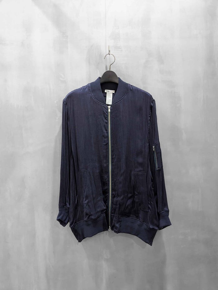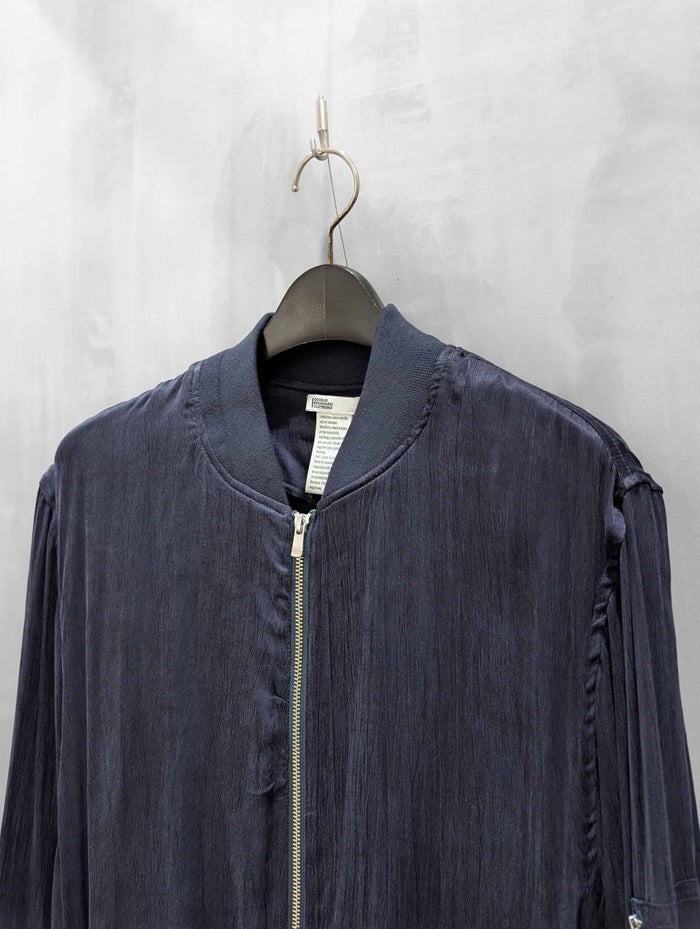 キュプラとレーヨンを混紡した再生繊維。 高級感とドレープ感のあるサテン織に「ワッシャー加工」を施すことで、生地の表面に凹凸感を与え、ナチュラルでしなやかな風合いが特徴のブルゾン。 後ろにはシャーリングを施しておりトレンド感のあるビッグシルエットに仕上げました。