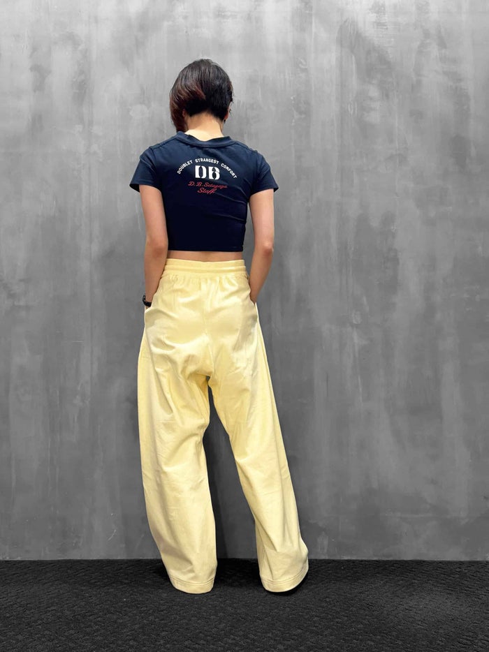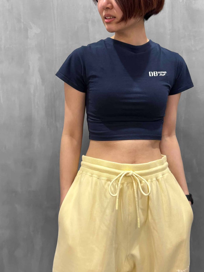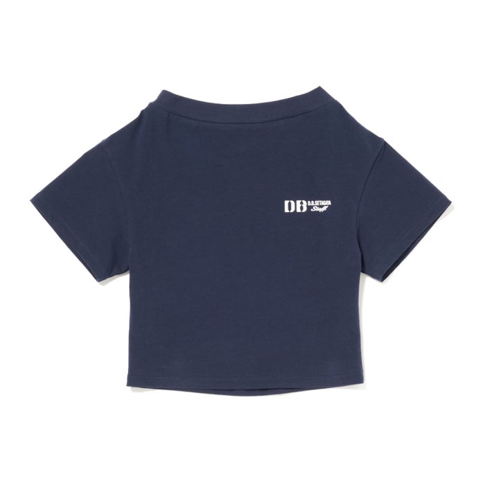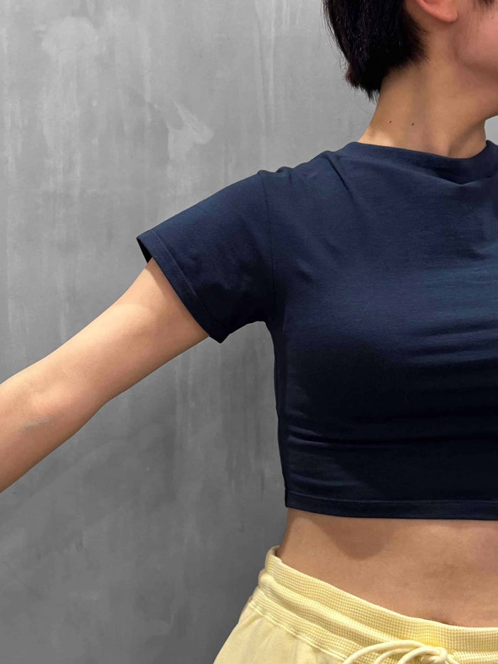 超ストレッチ素材で編まれたこのTシャツは、襟ぐりが大きく伸びることで、チューブトップに袖がついたようなスタイルでも着用可能。