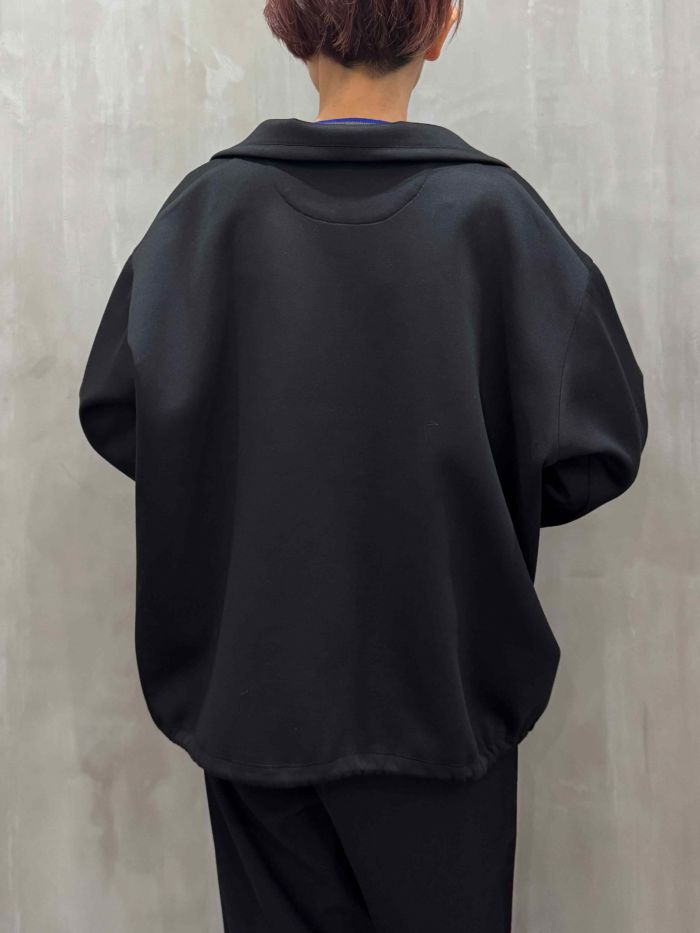 素材には肌あたりの優しいダンボールジャージを採用。モノフィラメント糸を使用していないためチクチクせず、軽やかで柔らかな着心地を実現しました。張り感がありながら立体的なフォルムが特徴で、ゆとりのあるサイジング設計により、中にニットやシャツを重ねても快適。アウター感覚で着られるのも魅力です。