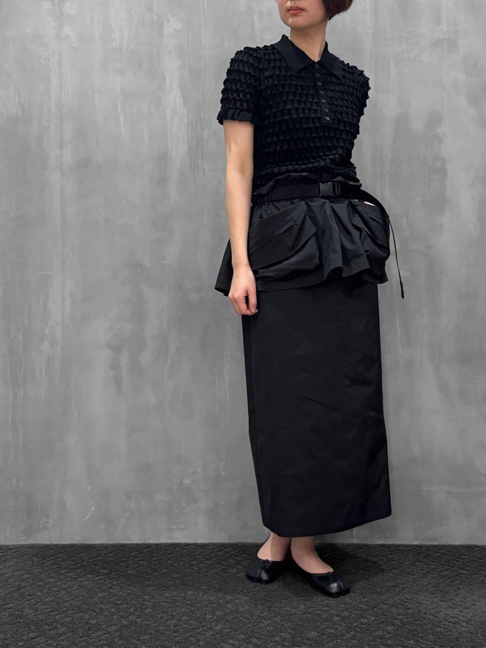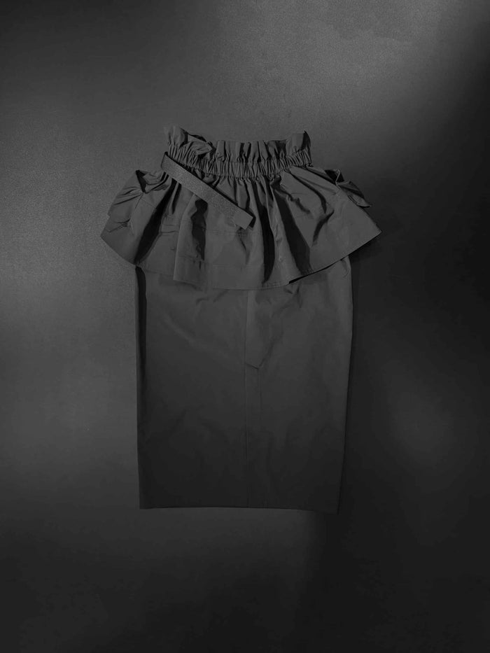 コルセット付きのスリムスカート。ウエストポーチのようなユーティリティ要素が詰まった、立体的なポケットディテールが特徴的です。クラシカルで有機的なフォルムを現代のハイスペックなスポーティデザインに落とし込んだ、個性が光るデザイン。ドレスライクなペプラムの膨らみと、スリムなスカートとのコントラストがメリハリのあるスタイルを作り出しています。またレイヤード仕立てなので、ヒップや気になる腰周りをさりげなくカバーし、実用性とドレスが上手く掛け合わされた機能美アイテムです。コルセット、スカート、それぞれ単体での着用が可能で、共に自由にウエストサイズ調節ができるアジャスト機能付き。素材は国内産の高密度のストレッチメモリータフタで快適な着心地感。ロゴTシャツやロンTと、ゆるっと、さらりと合わせたスタイリングがおすすめ。スニーカーにライン入りソックスやニット帽、キャップなど、ストリート風にドレスを楽しむ外しスタイリングも素敵です。
