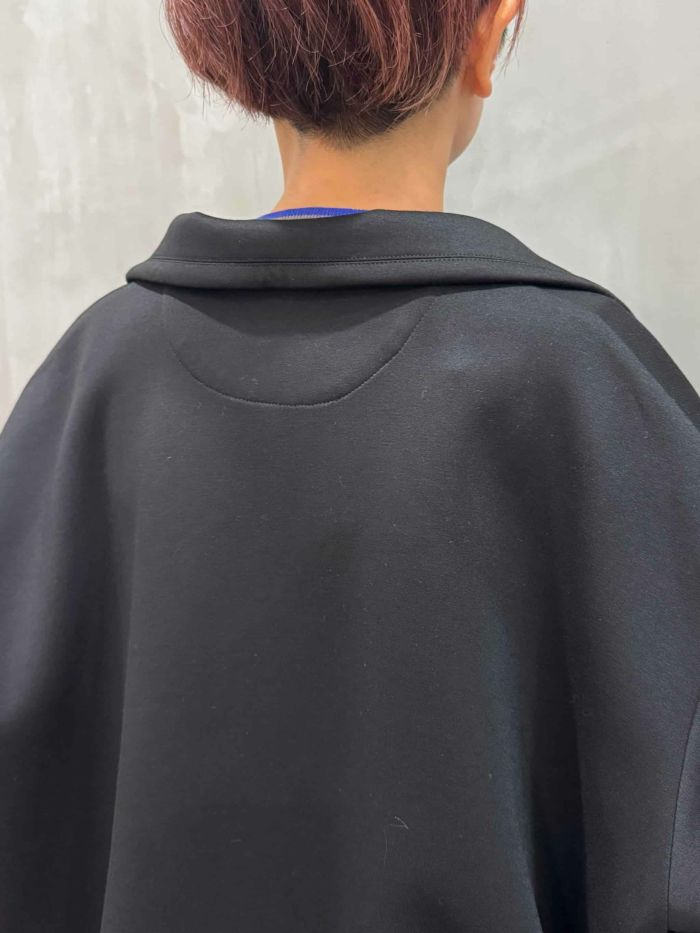 素材には肌あたりの優しいダンボールジャージを採用。モノフィラメント糸を使用していないためチクチクせず、軽やかで柔らかな着心地を実現しました。張り感がありながら立体的なフォルムが特徴で、ゆとりのあるサイジング設計により、中にニットやシャツを重ねても快適。アウター感覚で着られるのも魅力です。