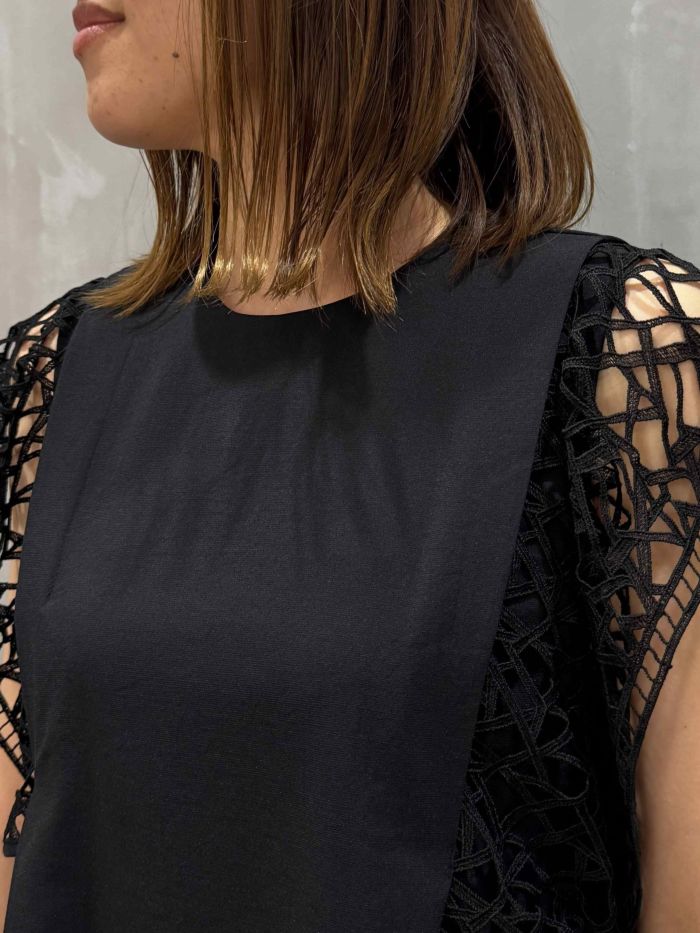 ブランド特注のレースを袖に贅沢にあしらった、フェミニンでエレガントなサマードレス。メッシュ調のレースが清涼感と華やかさを演出し、一枚で絵になるドラマティックな着こなしが叶います。