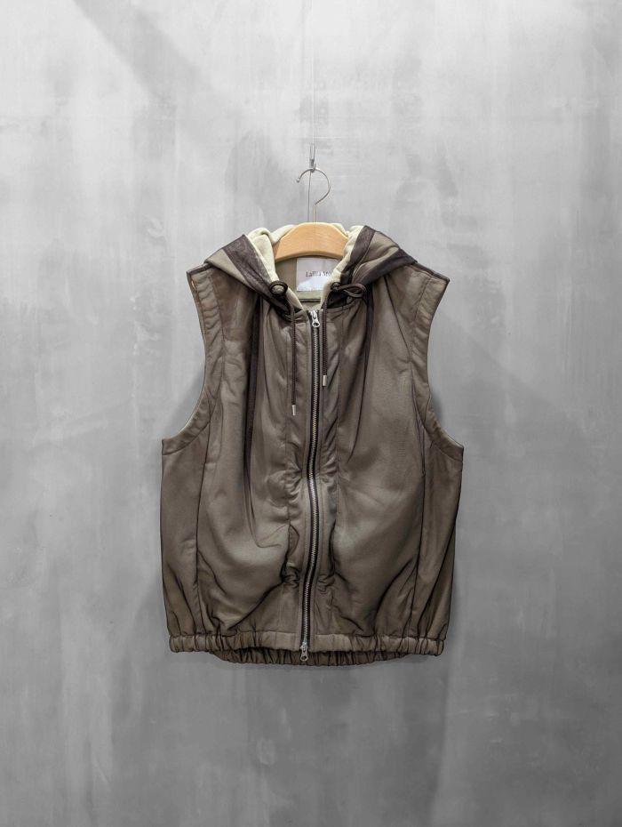 装いをクラスアップさせるデザインジップアップパーカー。内側はふんわりとした起毛素材であたたかく、気温の変化が激しい晩夏初秋に最適な調温アイテムです。冬季にはコートの下にライナー代わりに着用でき、ロングシーズン楽しめます。ベスト型ならではの動きやすさや、重ね着のしやすさが魅力でバルーンスリーブなどの袖にポイントがあるアイテムと好相性です。フロントはダブルジップファスナー仕様で、着こなしのアレンジ自在。ファスナー横にドローストリングが施さされておりギャザーを寄せて楽しむ遊び心溢れる一着です。