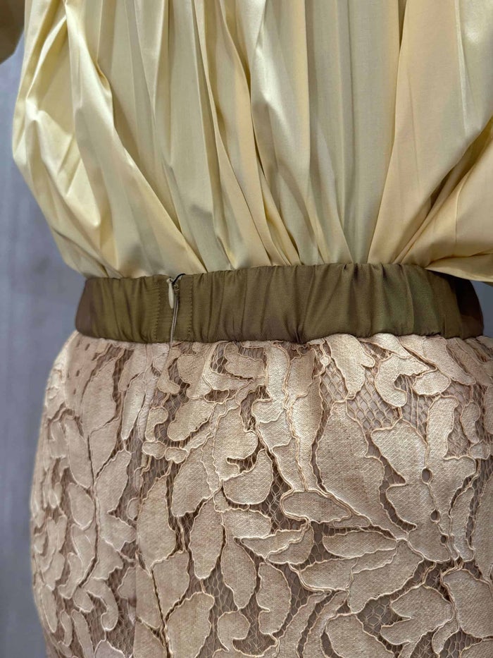 配色の裏地を合わせることで、ヴィンテージ風のラッセルレースをより美しく引き立てたタイトスカート。顔料染めでしか表現することができない、ヴィンテージのようなムラ感を持つラッセルレースを使用。張り付きすぎない程よいストレートシルエットで、スタイルにIラインを生み出すシンプルかつ洗練されたアイテムです。裏地はあえて丈差をつけ、足元を透かすことで軽く春らしい印象に。それぞれレースの色味に合わせてセレクトしたカラーの裏地でコントラストを演出し、表情に魅力的な奥行きを出しています。綺麗めからカジュアルまで幅広いスタイリングにマッチするフェミニンボトムです。