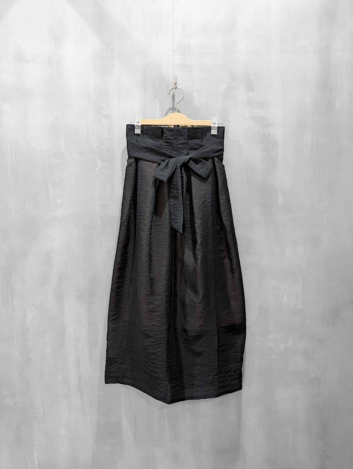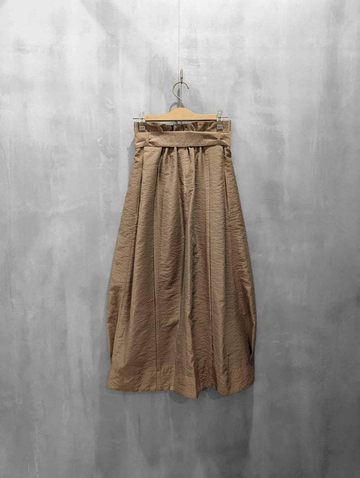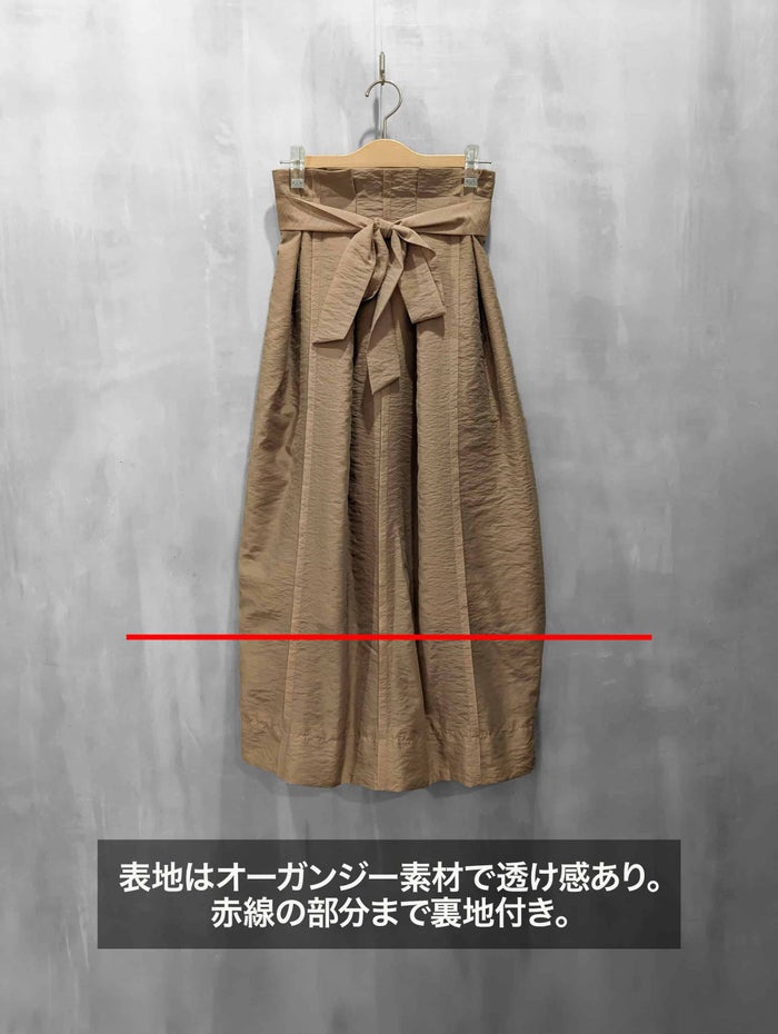 春らしい透けと、軽やかなボリュームのコクーンスカート。あえて、裏地は寸法をずらすことで透け感を強調し、大きく丈差をつけることで足元の抜け感を演出しています。低身長の方にも着用いただきやすいボリューム感で、裾にタックを取り、ややコクーンラインに仕上げることで、今年らしさとガーリーになりすぎないクラシックさを表現しています。程よい透けと透明感のあるオーガンジーを使用し、表面にはナチュラルにシボが入っているのでドレスライクになりすぎず、デイリーに着回しやすい一枚です。