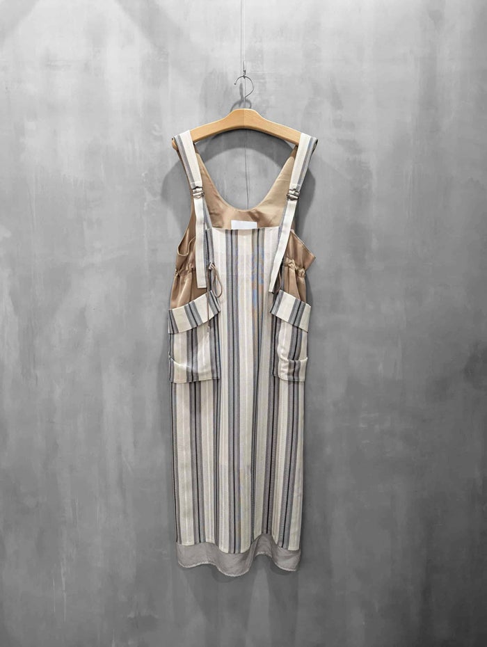 清涼感のあるメッシュストライプやチェック柄を大胆に使用し、暑い夏にも一枚で様になるジャンパードレス。程よくワイドな作りながら、ウエストを絞ってバランスを調整可能。ゆったりと涼しく着用できます。腰回りをカバーするアウトポケットはスタイルのアクセントとなり、ノースリーブアイテムからブラウスまで様々なインナーと組み合わせてロングシーズン着用できるアイテムです。