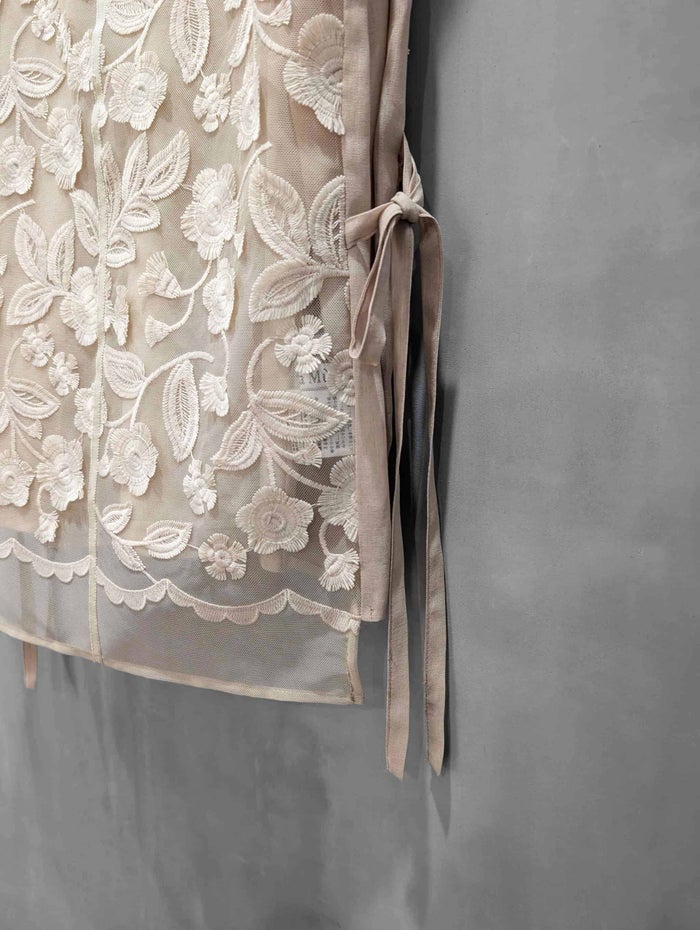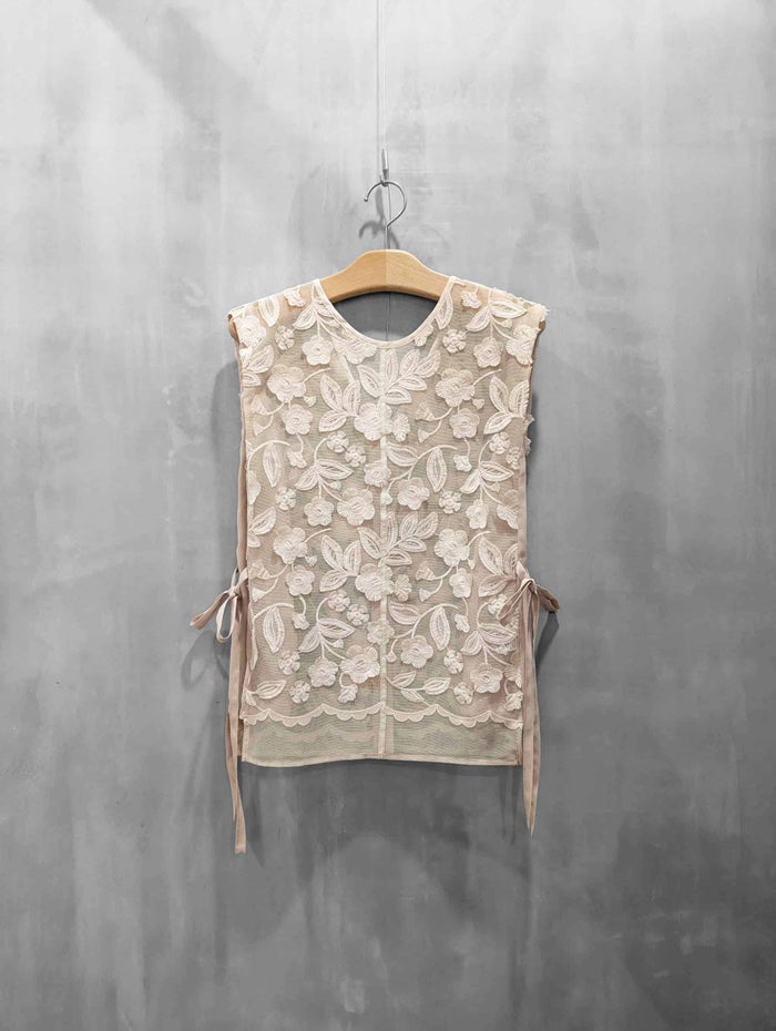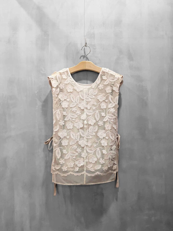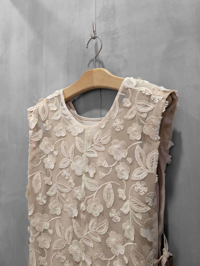 着こなし自在、二つの顔を持つ、大人の華やぎチュールベスト。いつもの装いに特別感を与える主役級ベスト。繊細なチュールの上に、立体的に浮かび上がる花のモチーフが、ラグジュアリーなムードあふれる素材です。贅沢に両面使いすることで、前後着用可能なデザインに落とし込みました。タンクトップ型のインナー付きで、一枚でも気兼ねなく着用いただけます。手持ちのカットソーやニット、ワンピースと合わせてスタイリングしたり、特別な日のドレスアップアイテムとしても最適です。まるでアートのような唯一無二の存在感で、装い全体を華やかに彩ります。
