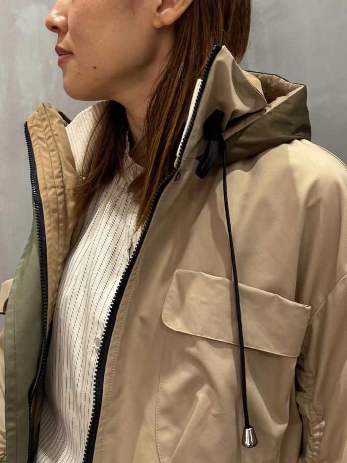 撥水性のあるマットでしなやかな伸びのあるポリエステル素材を使用することで、スポーティーになりがちなユーティリティーコートも柔らかな表情を醸し上品な印象です。