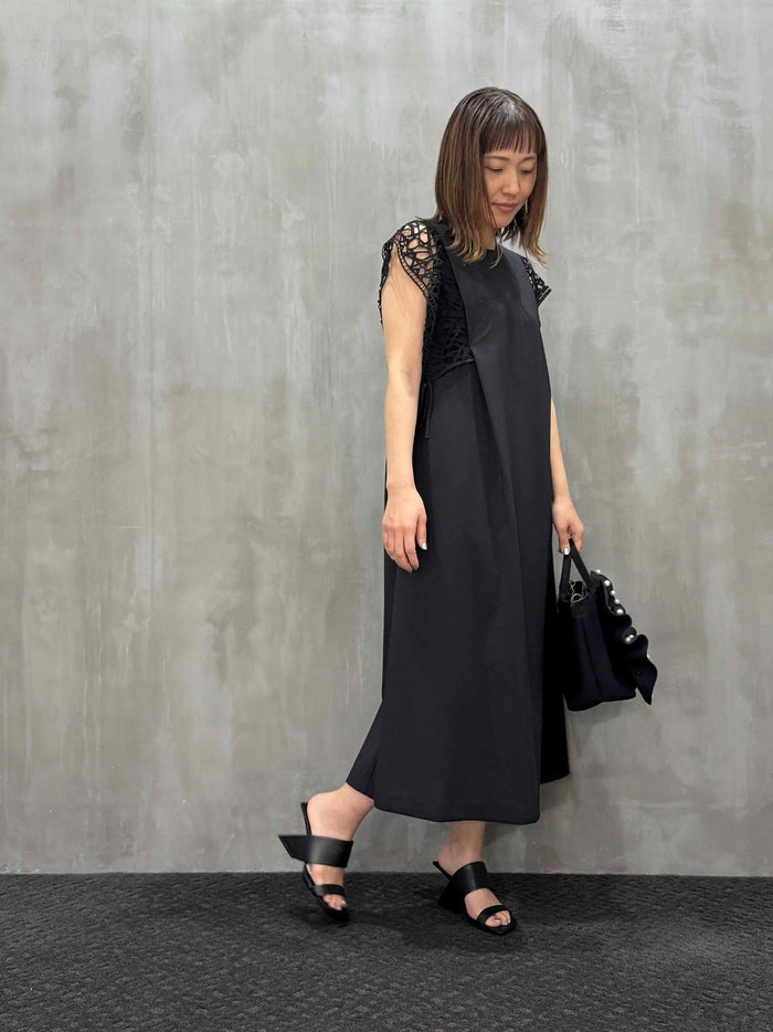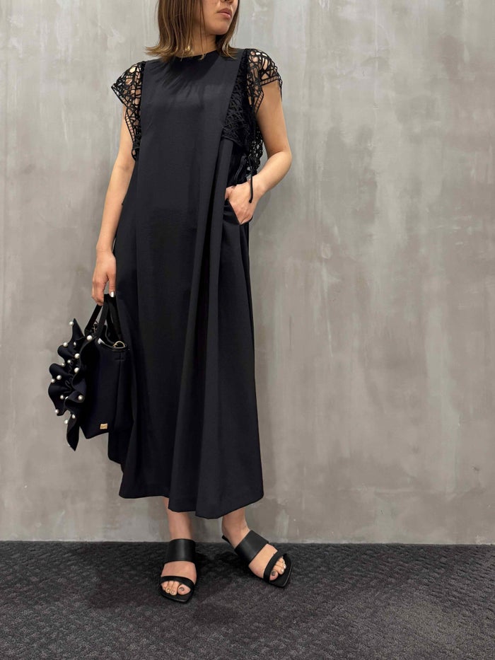 軽やかなポリエステル素材を使用した身頃は、肌にまとわりつかずさらっと快適。見た目の美しさだけでなく、ホームケアが可能なイージーケア性も魅力です。シックなブラックカラーは、羽織ものやアクセサリー次第でフォーマルにもカジュアルにも活躍。夏のお呼ばれやサマーオケージョン、ちょっとしたお出かけにもぴったりの一着です。