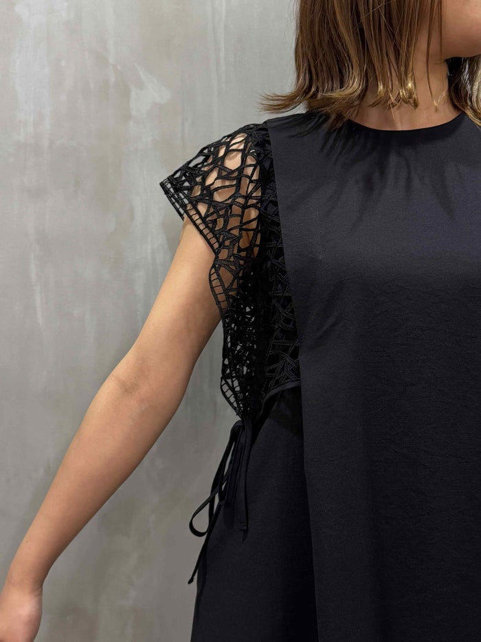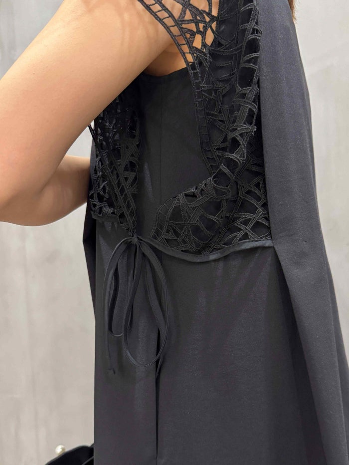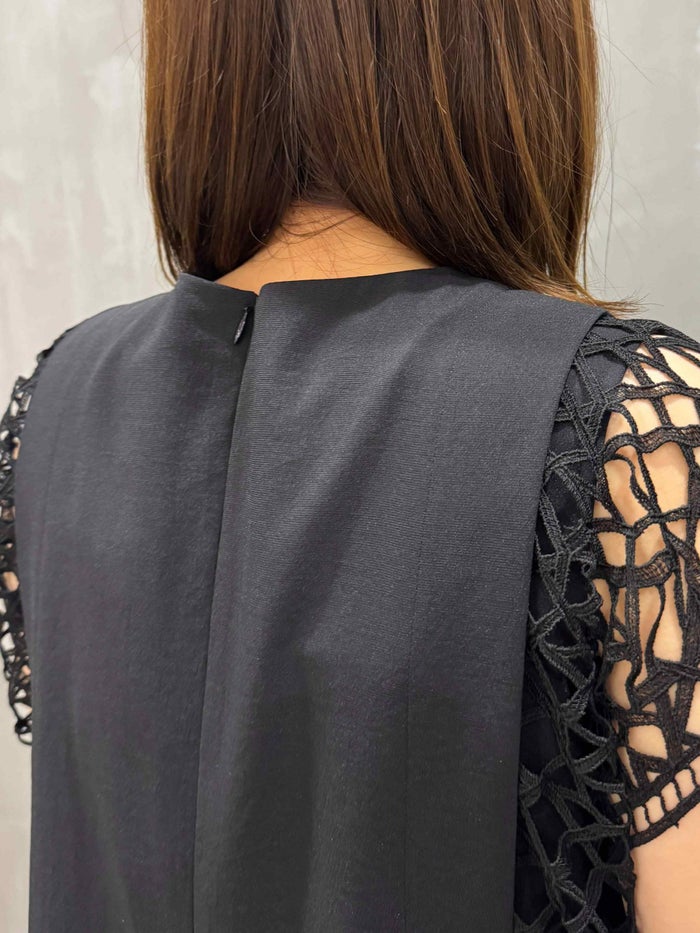ブランド特注のレースを袖に贅沢にあしらった、フェミニンでエレガントなサマードレス。メッシュ調のレースが清涼感と華やかさを演出し、一枚で絵になるドラマティックな着こなしが叶います。
