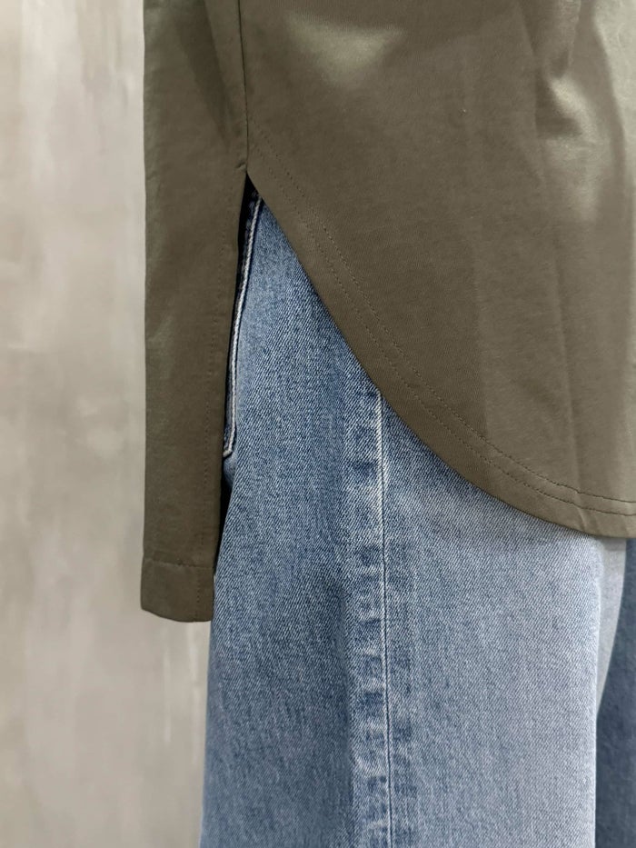 ヒジまで隠れる長めの袖丈は、気になる二の腕を自然にカバーしながら、落ち着きのある大人の印象に。ゆったりとしたシルエットと軽やかな素材感で、晩夏から初秋まで快適に過ごせるアイテムです。