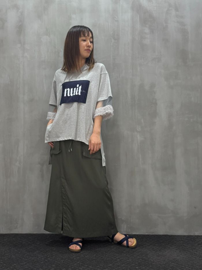 Lallia Mu(ラリアムー)の「ジャガードドッキングスリーブオーバーTシャツ」は、異素材を組み合わせた贅沢な仕立てで、カジュアルながらも女性らしさが光る一枚です。
