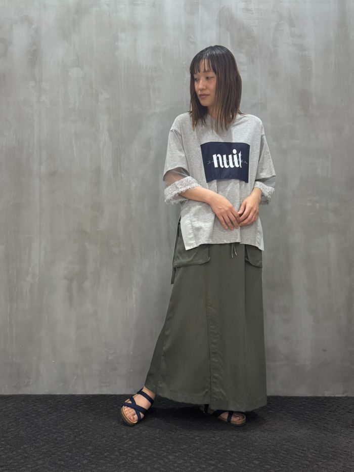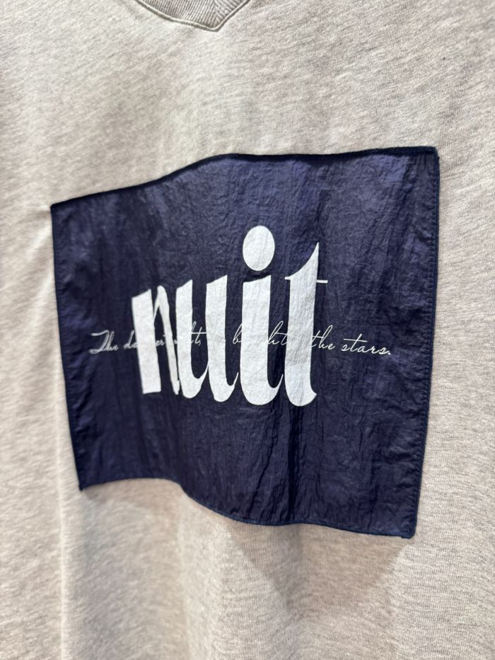 袖には、透け感のあるオーガンジー素材とフェザージャガードをドッキング。軽やかで立体的なスリーブが、夏の装いに涼感とフェミニンなムードをプラスします。フロントにはオーガンジーの上からロゴを重ね、繊細でセンシュアルな雰囲気に。ロゴには「夜が暗ければ暗いほど星は輝く」というメッセージが込められており、デザイン性とストーリー性の両方を感じられます。