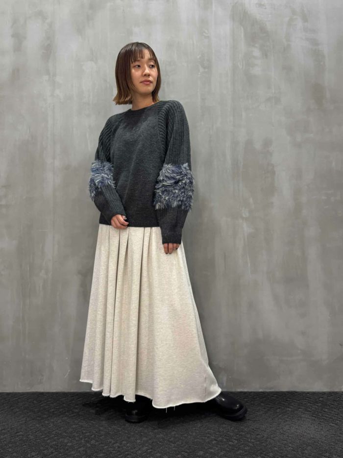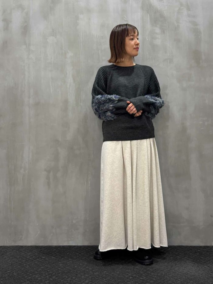 モヘヤ糸をループ編みすることでファーのような表情を表した人気のドッキングシリーズ。袖のカーブラインは女性らしさを感じるたまりを生み出し、程よるルーズなシルエットになるよう設計しています。パンツ/スカート、ボトムを選ばず、ワンピースなどの上に重ねてもバランスよく着用いただけます。