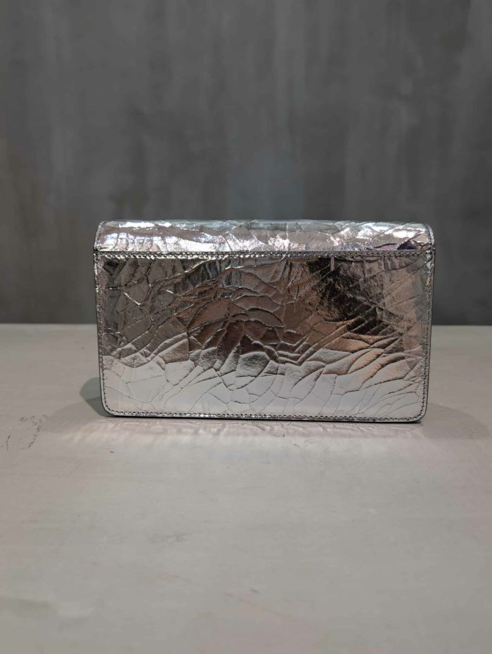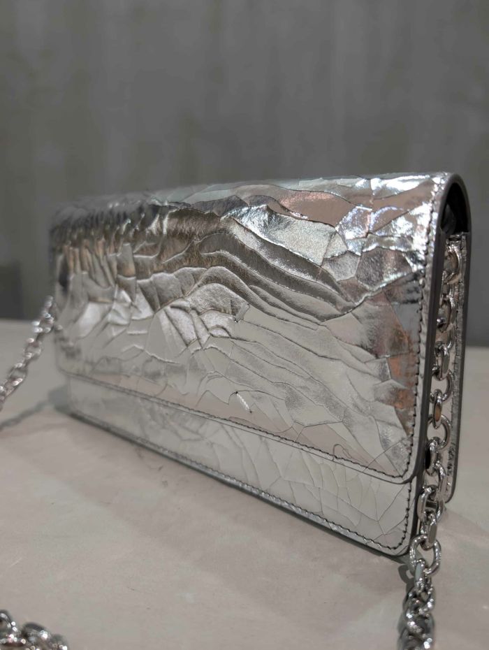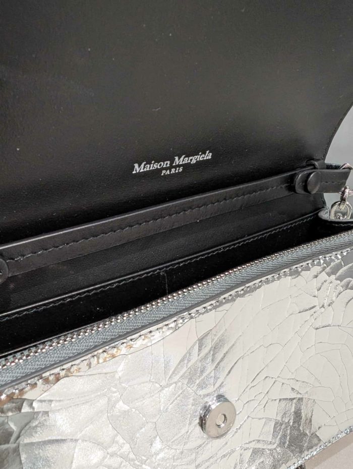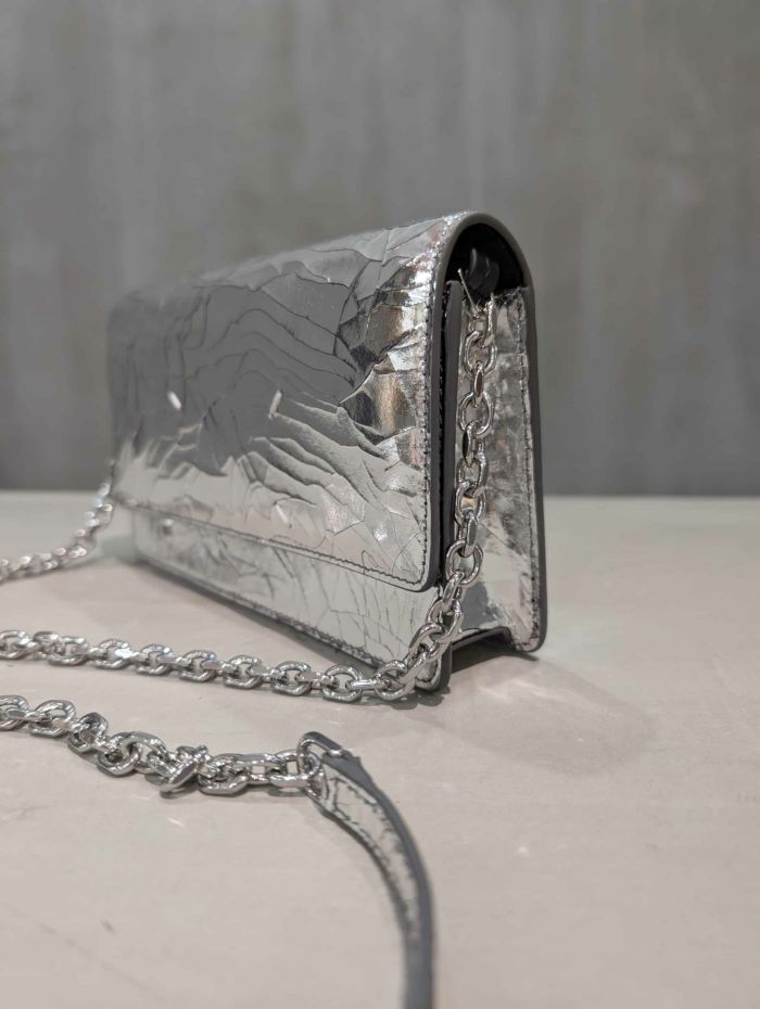 メゾンらしさを表現するブロークンミラー(ひび割れた鏡のような)加工が施された生地で作られたラージサイズのウォレットです。内側にファスナー付きのポケットを備え、ベルチャーリンクチェーンが付いています。ナンバリングのロゴがあしらわれています。フロントには、4本の白いステッチがあしらわれ、通常のファッションブランドのラベルとは対照的に、メゾン マルジェラらしい手作業を示しています