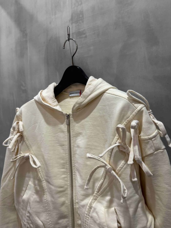 ヴィンテージ加工で可愛い印象のリボンディテールをモードに落とし込みました。