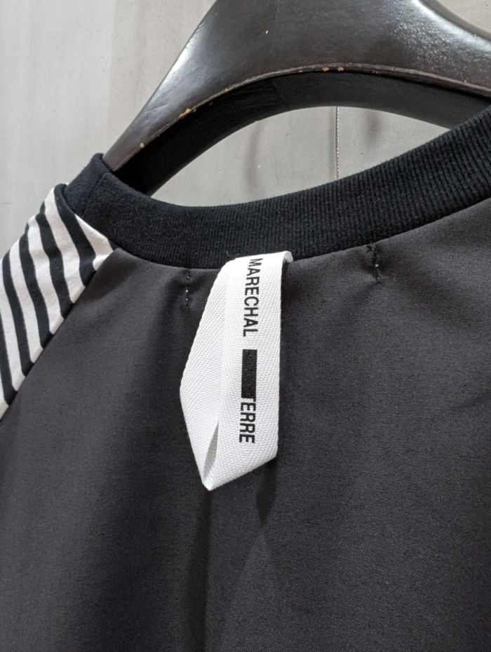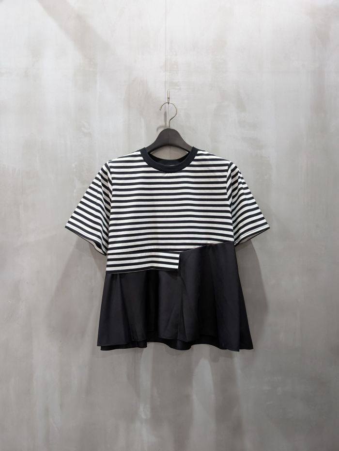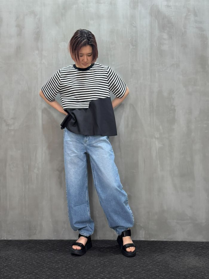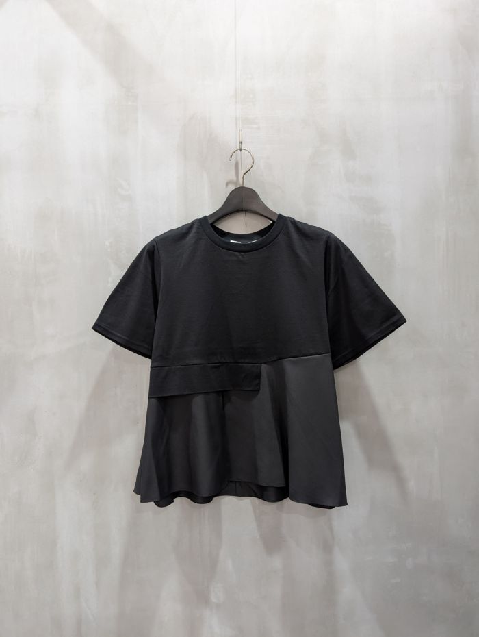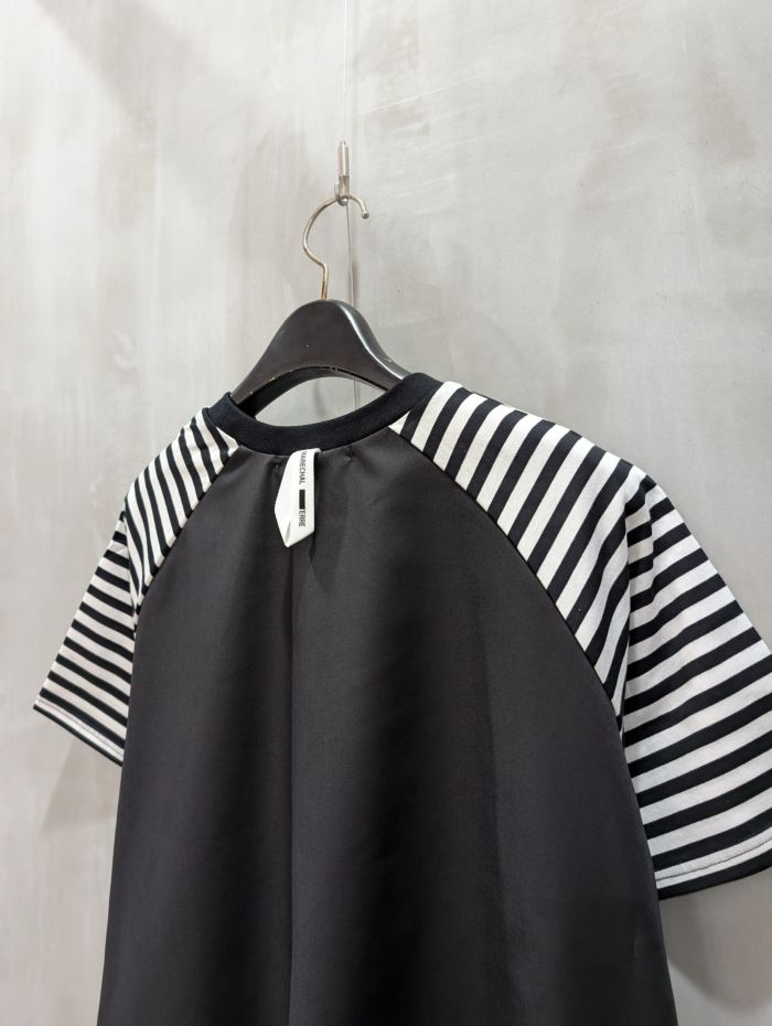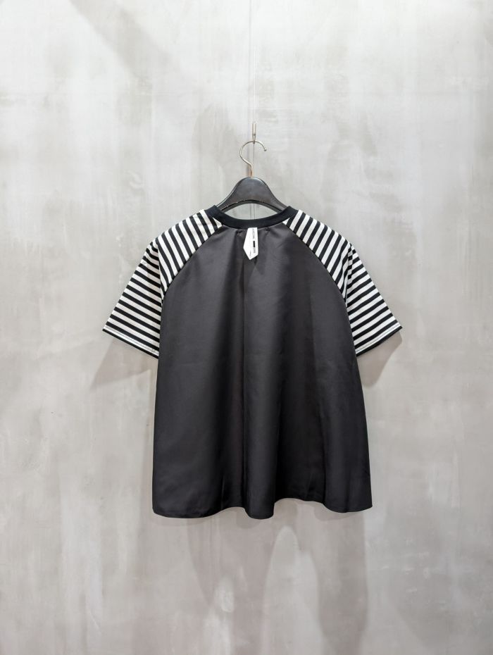 シルケット加工を施した綿100%の天竺素材をベースに、前裾と後ろ身頃をさらりとした布帛素材で切り替え、光沢感とドレープ感のある表情豊かな一着に仕上げています。特に後ろ身頃にはたっぷりとフレアを入れており、動くたびにふんわりと揺れるAラインシルエットが魅力。背中の中央にはオリジナルのロゴテープをあしらい、さりげないアクセントをプラスしています。