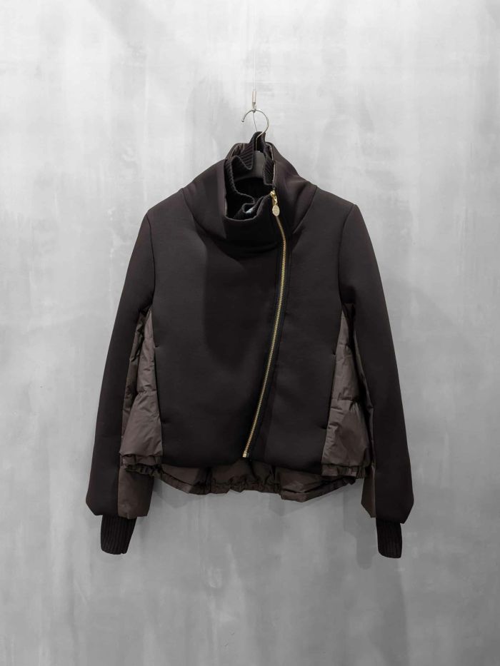 高さのあるスタンドカラーで首元の防寒にも優れ、ファスナーを下げると倒した衿が大きくアシンメトリーに開き、スタイリッシュ×スポーティな印象のアウターです。