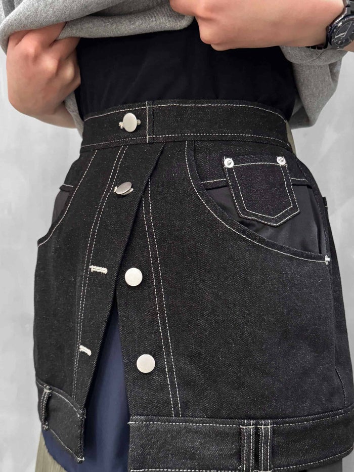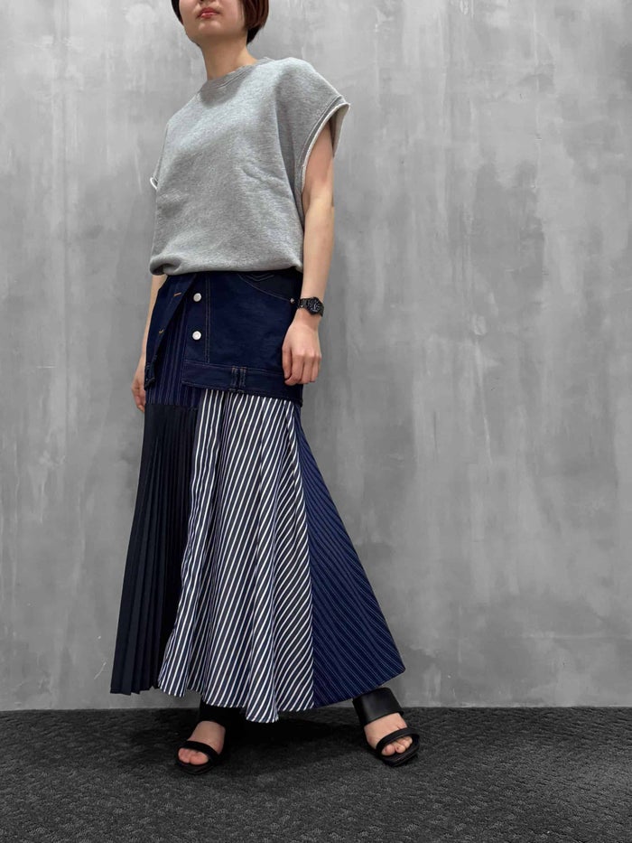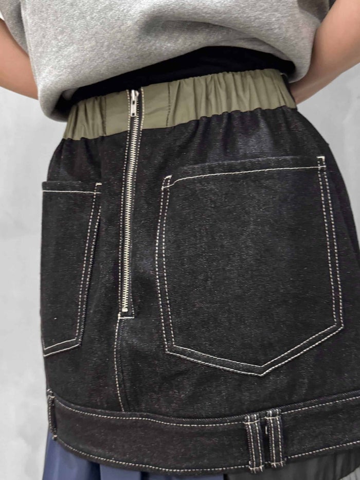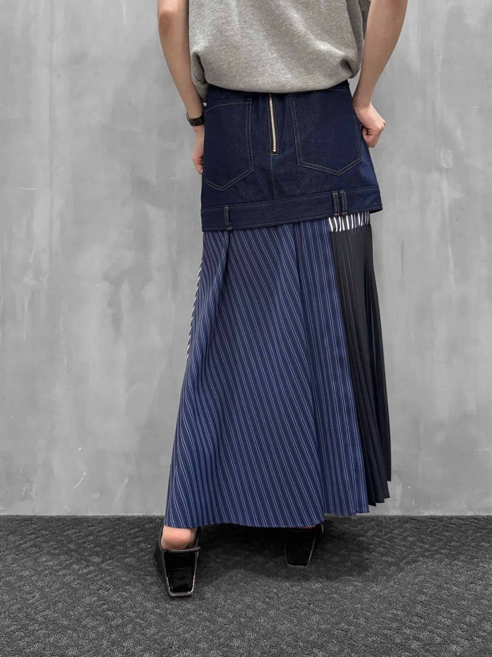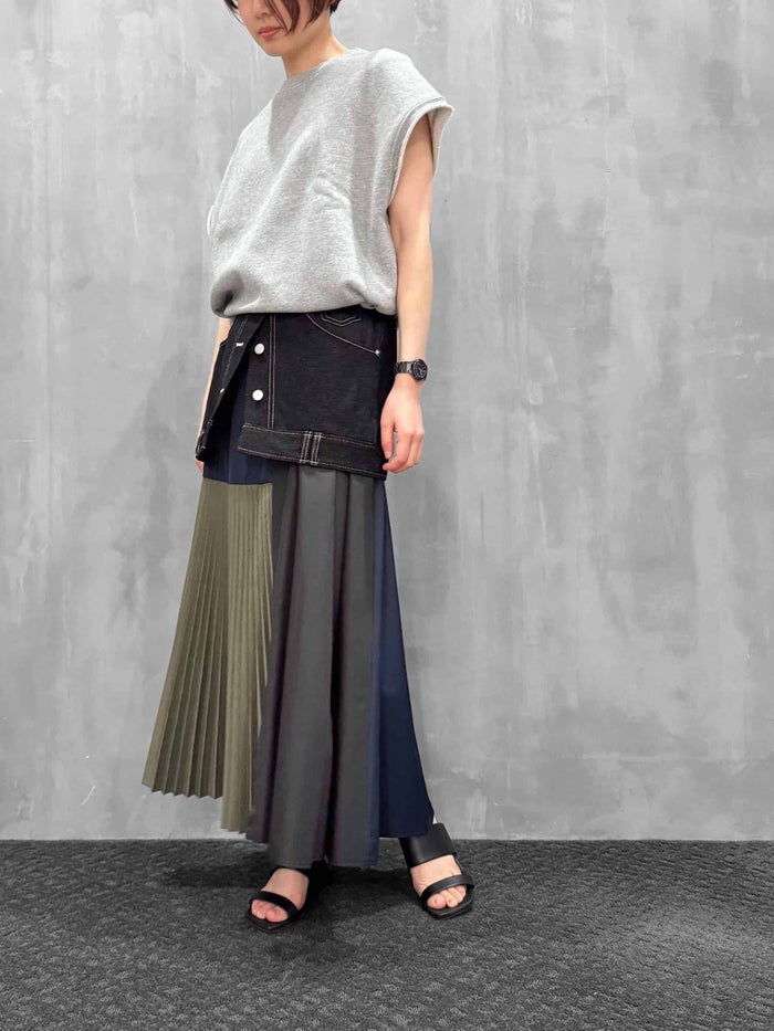 ■プリーツスカートの上にデニムスカートをレイヤードしたデティール