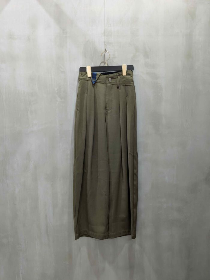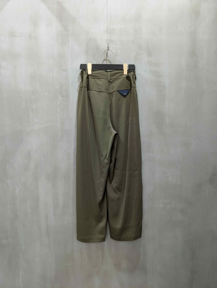 コクーン風のシルエットながら、カーブを抑えたバランス感のあるデザインで、体のラインを拾わずスッキリとした印象に。フロントのタックにはさりげない配色ステッチが施され、ディテールにまでこだわりを感じさせます。ウエストはベルト仕様で両サイドにゴムが入り、ラクな穿き心地ときちんと感を両立。右ベルトループには配色のグログランテープをあしらい、アクセントをプラスしています。
