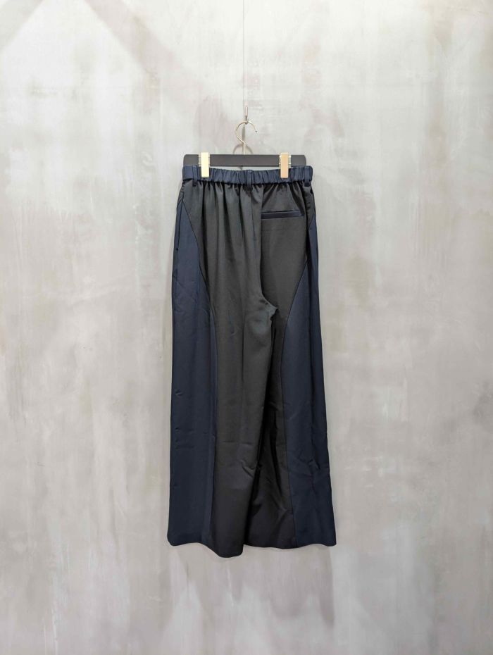 シルクのような滑らかな肌触りと、美しい落ち感が魅力のバイカラーワイドパンツ。両サイドに配された異素材の切り替えデザインが、縦ラインを強調し、スタイルアップ効果を演出します。ウエストは前ベルト×後ろゴムの仕様で、きちんと見えしながらもストレスフリーな着心地を実現。ワンタックから流れるセンタープレスが脚をすっきり見せ、大人のモードスタイルにぴったりの一本です。